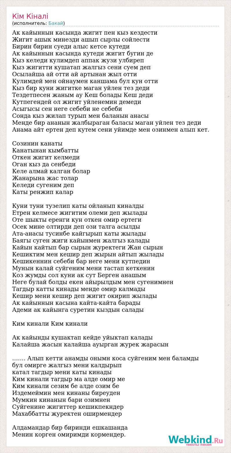 Ак кайыннын касында жигит пен кыз кездести Жигит ашык минезди ашып сырлы сойлести Бирин бирин суеди алыс кетсе кутеди Ак кайыннын касында кутеди жигит бугин де Кыз келеди кулимдеп аппак жузи улбиреп Кыз жигитти кушатап жалгыз сени суем деп Осылайша ай отти ай артынан жыл отти Кулимдей мен ойнаумен каншама бул кун отти Кыз бир куни жигитке маган уйлен тез деди Тездетпесен жаным ау Кеш болады Кеш деди Кутпегендей ол жигит уйленемин демеди Асыгысы сен неге себеби не себеби Сонда кыз жилап турып мен баланын анасы Менде бир ананын жалбыраган баласы маган уйлен тез деди Анама айт ертен деп кутем сени уйимде мен озинмен алып кет. Созинин канаты Канатынан кымбатты Откен жигит келмеди Оган кыз да сенбеди Келе алмай калган болар Жанарына жас толар Келеди сугеним деп Каты ренжип калар Куни туни тузелип каты ойланып киналды Етрен келмесе жигитим олеми деп жылады Оте шыкты еренги кун откен омир ертеги Осек мине олтирди деп ози талга асылды Ата-анасы тусинбе кайгырып каты жылады Баягы суген жиги кайынмен жалгыз калады Кайын кайтып бар сырын журектеги Жан сырын Кешиктим мен кешир деп жырын айтып жылады Кешикеннин себеби бар неге мени кутпедин Мунын калай суйгеним мени тастап кеткенин Коз жумды сол куни ак сут Берген анашым Неге булай болды екен айырылдым мен сугенимнен Тагдыр катты кинады менде омир калмады Кешир мени кешир деп жигит окирип жылады Ак кайыннын касына кайта-кайта барады Адеми ак кайынга суретин кыздын салады Ким кинали Ким кинали Ак кайынды кушактап кейде уйыктап калады Калайша жасын калайша ауырган журек жарасын ……. Алып кетти анамды онымн коса суйгеним мен баламды бул омирге жалгыз мени калдырып катал тагдыр мени каты кинады Ким кинали тагдыр ма алде омир ме Ким кинали сезим бе алде озим бе Издемеймин мен кинаны биреуден Мумкин кинанын бари озимнен Суйгенине жигиттер кешикпекндер Махаббатты журектен оширмендер Алдамандар бир биринди ешкашанда Менин корген омиримди кормендер.