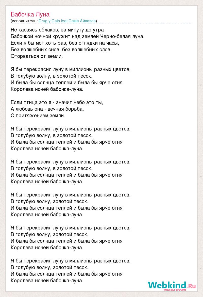 Не касаясь облаков, за минуту до утра Бабочкой ночной кружит над землей Черно-белая луна. Если я бы мог хоть раз, без оглядки на часы, Без волшебных снов, без волшебных слов Оторваться от земли. Я бы перекрасил луну в миллионы разных цветов, В голубую волну, в золотой песок. И была бы солнца теплей и была бы ярче огня Королева ночей бабочка-луна. Если птица это я - значит небо это ты, А любовь она - вечная борьба, С притяжением земли. Я бы перекрасил луну в миллионы разных цветов, В голубую волну, в золотой песок. И была бы солнца теплей и была бы ярче огня Королева ночей бабочка-луна. Я бы перекрасил луну в миллионы разных цветов, В голубую волну, в золотой песок. И была бы солнца теплей и была бы ярче огня Королева ночей бабочка-луна. Я бы перекрасил луну в миллионы разных цветов, В голубую волну, золотой песок. И была бы солнца теплей и была бы ярче огня Королева ночей бабочка-луна. Я бы перекрасил луну в миллионы разных цветов, В голубую волну, золотой песок. И была бы солнца теплей и была бы ярче огня Королева ночей бабочка-луна. Я бы перекрасил луну в миллионы разных цветов, В голубую волну, золотой песок. И была бы солнца теплей и была бы ярче огня Королева ночей бабочка-луна.