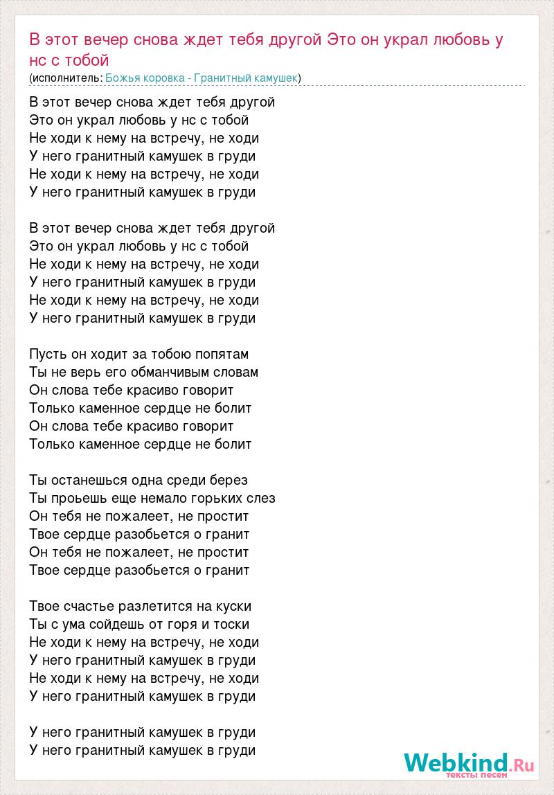 В этот вечер снова ждет тебя другой Это он украл любовь у нс с тобой Не ходи к нему на встречу, не ходи У него гранитный камушек в груди Не ходи к нему на встречу, не ходи У него гранитный камушек в груди В этот вечер снова ждет тебя другой Это он украл любовь у нс с тобой Не ходи к нему на встречу, не ходи У него гранитный камушек в груди Не ходи к нему на встречу, не ходи У него гранитный камушек в груди Пусть он ходит за тобою попятам Ты не верь его обманчивым словам Он слова тебе красиво говорит Только каменное сердце не болит Он слова тебе красиво говорит Только каменное сердце не болит Ты останешься одна среди берез Ты проьешь еще немало горьких слез Он тебя не пожалеет, не простит Твое сердце разобьется о гранит Он тебя не пожалеет, не простит Твое сердце разобьется о гранит Твое счастье разлетится на куски Ты с ума сойдешь от горя и тоски Не ходи к нему на встречу, не ходи У него гранитный камушек в груди Не ходи к нему на встречу, не ходи У него гранитный камушек в груди У него гранитный камушек в груди У него гранитный камушек в груди