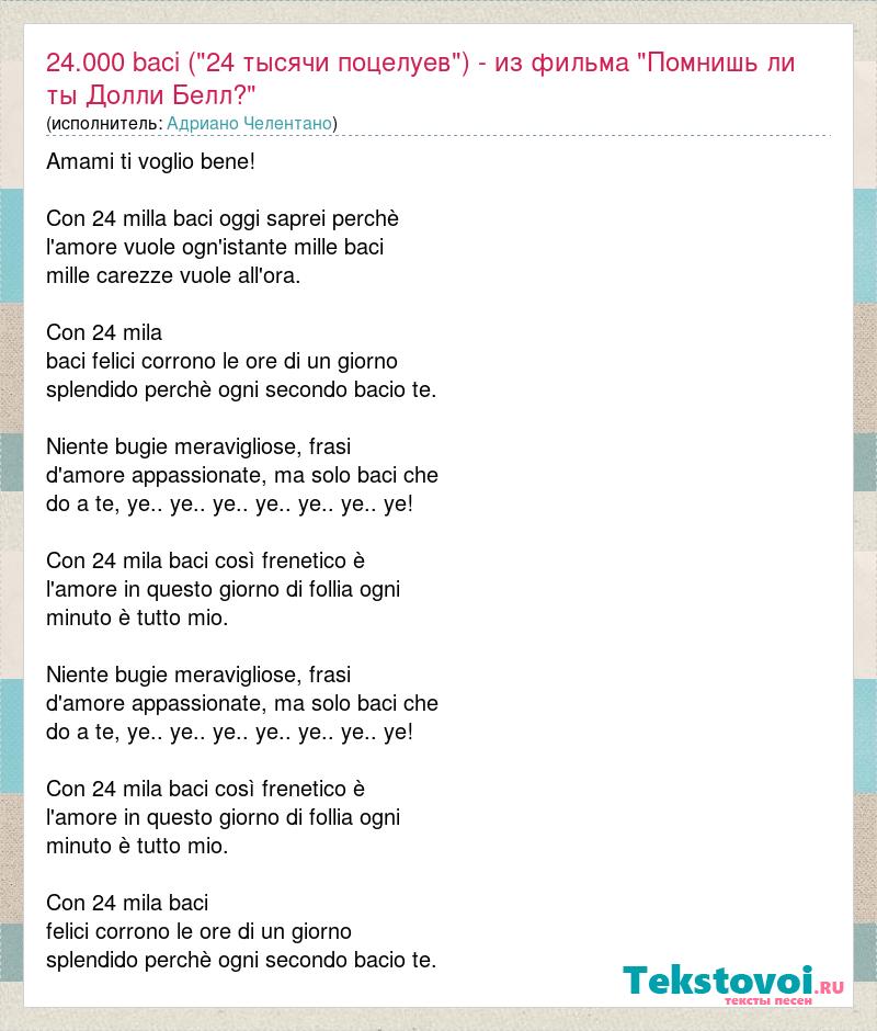 Amami ti voglio bene! Con 24 milla baci oggi saprei perchè l'amore vuole ogn'istante mille baci mille carezze vuole all'ora. Con 24 mila baci felici corrono le ore di un giorno splendido perchè ogni secondo bacio te. Niente bugie meravigliose, frasi d'amore appassionate, ma solo baci che do a te, ye.. ye.. ye.. ye.. ye.. ye.. ye! Con 24 mila baci così frenetico è l'amore in questo giorno di follia ogni minuto è tutto mio. Niente bugie meravigliose, frasi d'amore appassionate, ma solo baci che do a te, ye.. ye.. ye.. ye.. ye.. ye.. ye! Con 24 mila baci così frenetico è l'amore in questo giorno di follia ogni minuto è tutto mio. Con 24 mila baci felici corrono le ore di un giorno splendido perchè ogni secondo bacio te.