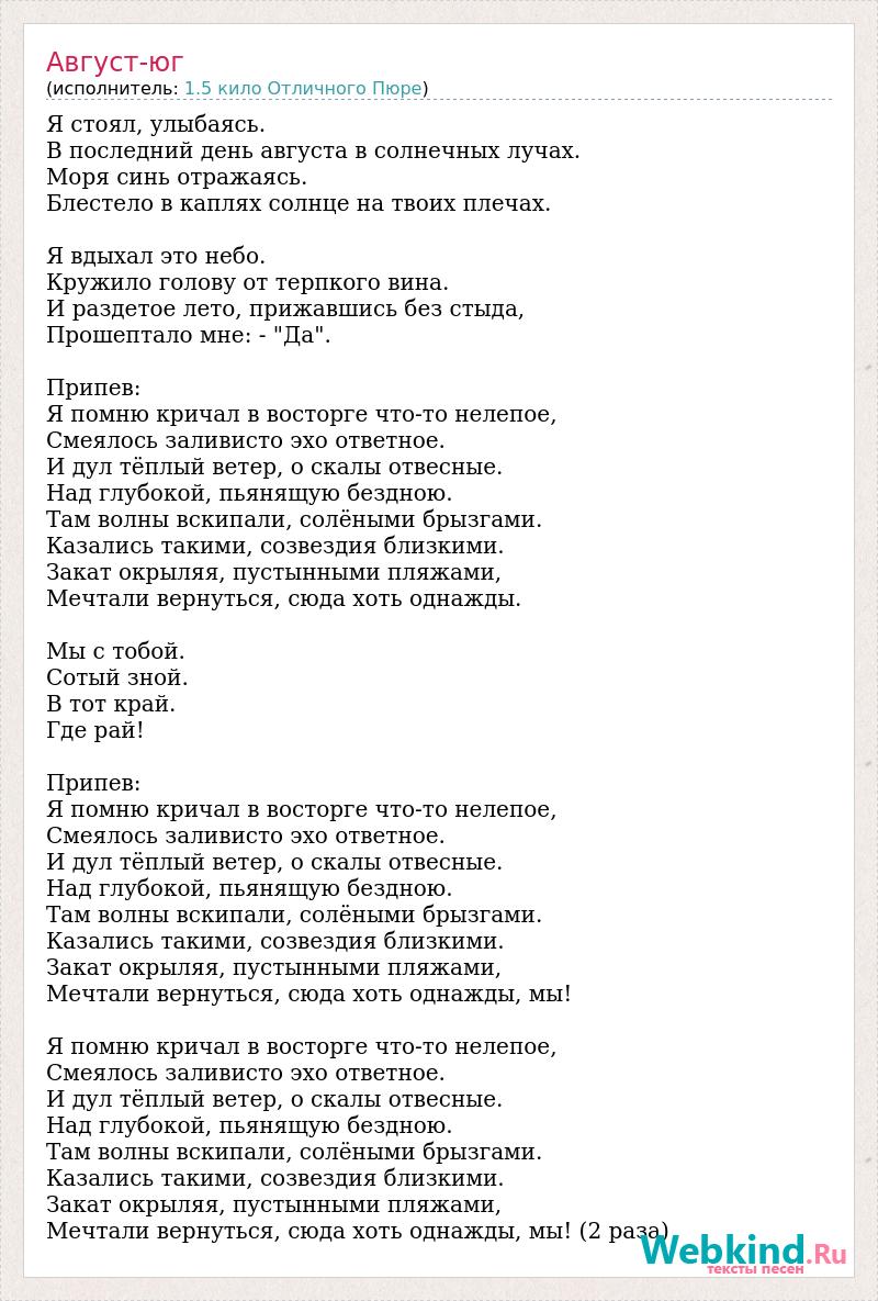 Я стоял, улыбаясь. В последний день августа в солнечных лучах. Моря синь отражаясь. Блестело в каплях солнце на твоих плечах. Я вдыхал это небо. Кружило голову от терпкого вина. И раздетое лето, прижавшись без стыда, Прошептало мне: - "Да". Припев: Я помню кричал в восторге что-то нелепое, Смеялось заливисто эхо ответное. И дул тёплый ветер, о скалы отвесные. Над глубокой, пьянящую бездною. Там волны вскипали, солёными брызгами. Казались такими, созвездия близкими. Закат окрыляя, пустынными пляжами, Мечтали вернуться, сюда хоть однажды. Мы с тобой. Сотый зной. В тот край. Где рай! Припев: Я помню кричал в восторге что-то нелепое, Смеялось заливисто эхо ответное. И дул тёплый ветер, о скалы отвесные. Над глубокой, пьянящую бездною. Там волны вскипали, солёными брызгами. Казались такими, созвездия близкими. Закат окрыляя, пустынными пляжами, Мечтали вернуться, сюда хоть однажды, мы! Я помню кричал в восторге что-то нелепое, Смеялось заливисто эxо ответное. И дул тёплый ветер, о скалы отвесные. Над глубокой, пьянящую бездною. Там волны вскипали, солёными брызгами. Казались такими, созвездия близкими. Закат окрыляя, пустынными пляжами, Мечтали вернуться, сюда хоть однажды, мы! (2 раза)