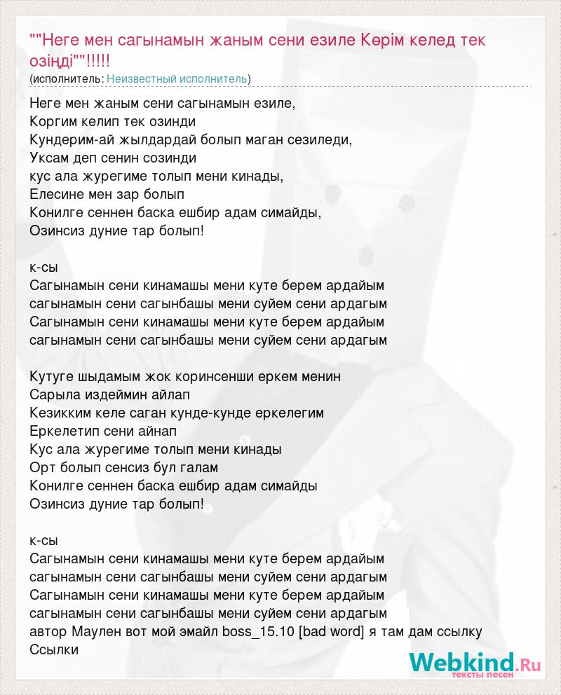 Неге мен жаным сени сагынамын езиле, Коргим келип тек озинди Кундерим-ай жылдардай болып маган сезиледи, Уксам деп сенин созинди кус ала журегиме толып мени кинады, Елесине мен зар болып Конилге сеннен баска ешбир адам симайды, Озинсиз дуние тар болып! к-сы Сагынамын сени кинамашы мени куте берем ардайым сагынамын сени сагынбашы мени суйем сени ардагым Сагынамын сени кинамашы мени куте берем ардайым сагынамын сени сагынбашы мени суйем сени ардагым Кутуге шыдамым жок коринсенши еркем менин Сарыла издеймин айлап Кезикким келе саган кунде-кунде еркелегим Еркелетип сени айнап Кус ала журегиме толып мени кинады Орт болып сенсиз бул галам Конилге сеннен баска ешбир адам симайды Озинсиз дуние тар болып! к-сы Сагынамын сени кинамашы мени куте берем ардайым сагынамын сени сагынбашы мени суйем сени ардагым Сагынамын сени кинамашы мени куте берем ардайым сагынамын сени сагынбашы мени суйем сени ардагым автор Маулен вот мой эмайл boss_15.10 [bad word] я там дам ссылку Ссылки
