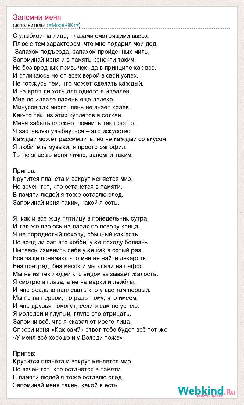 С улыбкой на лице, глазами смотрящими вверх, Плюс с тем характером, что мне подарил мой дед, Запахом подъезда, запахом пройденных миль, Запоминай меня и в память конекти таким. Не без вредных привычек, да в принципе как все. И отличаюсь не от всех верой в свой успех. Не горжусь тем, что может сделать каждый. И на вряд ли хоть для одного я идеален. Мне до идеала парень ещё далеко. Минусов так много, лень не знает краёв. Как-то так, из этих куплетов я соткан. Меня забыть сложно, помнить так просто. Я заставляю улыбнуться – это искусство. Каждый может рассмешить, но не каждый со вкусом. Я любитель музыки, я просто рэпофил. Ты не знаешь меня лично, запомни таким. Припев: Крутится планета и вокруг меняется мир, Но вечен тот, кто останется в памяти. В памяти людей я тоже оставлю след. Запоминай меня таким, какой я есть. Я, как и все жду пятницу в понедельник сутра. И так же парюсь на парах по поводу конца. Я не породистый походу, обычный как есть. Но вряд ли рэп это хобби, уже походу болезнь. Пытаясь изменить себя уже как в сотый раз, Всё чаще понимаю, что мне не найти лекарств. Без преград, без масок и мы клали на пафос. Мы не из тех людей кто видом вызывает жалость. Я смотрю в глаза, а не на марки и лейблы. И мне реально наплевать кто у вас там первый. Мы не на первом, но рады тому, что имеем. И мне друзья помогут, если я сам не успею. Я молодой и глупый, глупо это отрицать. Запомни всё, что я сказал от моего лица. Спроси меня «Как сам?» ответ тебе будет всё тот же «У меня всё хорошо и у Володи тоже» Припев: Крутится планета и вокруг меняется мир, Но вечен тот, кто останется в памяти. В памяти людей я тоже оставлю след. Запоминай меня таким, какой я есть