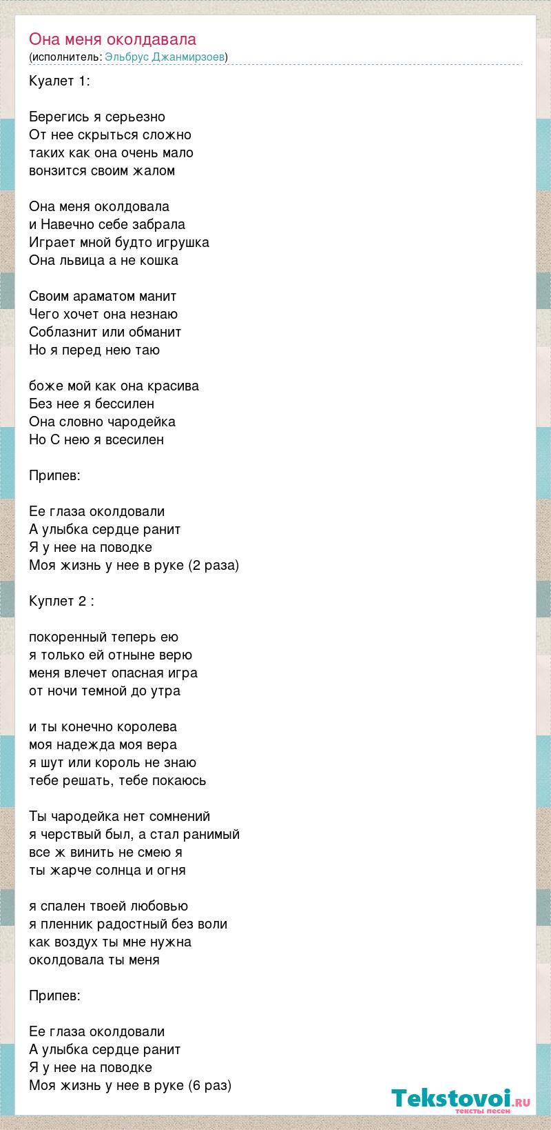 Куалет 1: Берегись я серьезно От нее скрыться сложно таких как она очень мало вонзится своим жалом Она меня околдовала и Навечно себе забрала Играет мной будто игрушка Она львица а не кошка Своим араматом манит Чего хочет она незнаю Соблазнит или обманит Но я перед нею таю боже мой как она красива Без нее я бессилен Она словно чародейка Но С нею я всесилен Припев: Ее глаза околдовали А улыбка сердце ранит Я у нее на поводке Моя жизнь у нее в руке (2 раза) Куплет 2 : покоренный теперь ею я только ей отныне верю меня влечет опасная игра от ночи темной до утра и ты конечно королева моя надежда моя вера я шут или король не знаю тебе решать, тебе покаюсь Ты чародейка нет сомнений я черствый был, а стал ранимый все ж винить не смею я ты жарче солнца и огня я спален твоей любовью я пленник радостный без воли как воздух ты мне нужна околдовала ты меня Припев: Ее глаза околдовали А улыбка сердце ранит Я у нее на поводке Моя жизнь у нее в руке (6 раз)