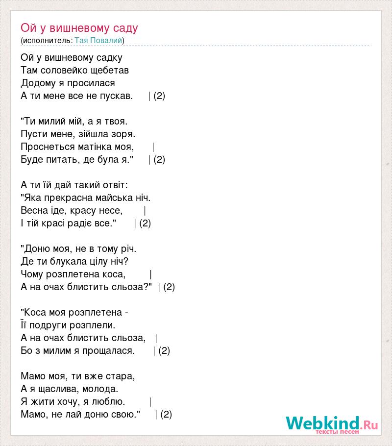 Ой у вишневому садку Там соловейко щебетав Додому я просилася А ти мене все не пускав. | (2) "Ти милий мій, а я твоя. Пусти мене, зійшла зоря. Проснеться матінка моя, | Буде питать, де була я." | (2) А ти їй дай такий отвіт: "Яка прекрасна майська ніч. Весна іде, красу несе, | І тій красі радіє все." | (2) "Доню моя, не в тому річ. Де ти блукала цілу ніч? Чому розплетена коса, | А на очах блистить сльоза?" | (2) "Коса моя розплетена - Її подруги розплели. А на очах блистить сльоза, | Бо з милим я прощалася. | (2) Мамо моя, ти вже стара, А я щаслива, молода. Я жити хочу, я люблю. | Мамо, не лай доню свою." | (2)