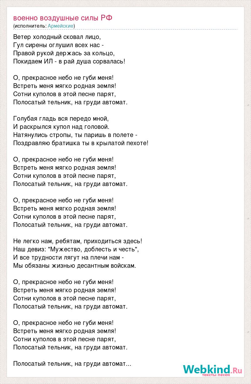 Ветер холодный сковал лицо, Гул сирены оглушил всех нас - Правой рукой держась за кольцо, Покидаем ИЛ - в рай душа сорвалась! О, прекрасное небо не губи меня! Встреть меня мягко родная земля! Сотни куполов в этой песне парят, Полосатый тельник, на груди автомат. Голубая гладь вся передо мной, И раскрылся купол над головой. Натянулись стропы, ты паришь в полете - Поздравляю братишка ты в крылатой пехоте! О, прекрасное небо не губи меня! Встреть меня мягко родная земля! Сотни куполов в этой песне парят, Полосатый тельник, на груди автомат. О, прекрасное небо не губи меня! Встреть меня мягко родная земля! Сотни куполов в этой песне парят, Полосатый тельник, на груди автомат. Не легко нам, ребятам, приходиться здесь! Наш девиз: "Мужество, доблесть и честь", И все трудности лягут на плечи нам - Мы обязаны жизнью десантным войскам. О, прекрасное небо не губи меня! Встреть меня мягко родная земля! Сотни куполов в этой песне парят, Полосатый тельник, на груди автомат. О, прекрасное небо не губи меня! Встреть меня мягко родная земля! Сотни куполов в этой песне парят, Полосатый тельник, на груди автомат. Полосатый тельник, на груди автомат...