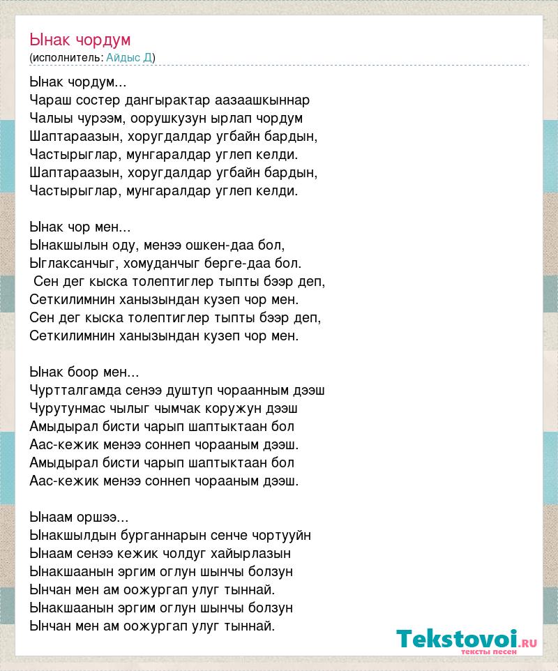 Ынак чордум... Чараш состер дангырактар аазаашкыннар Чалыы чурээм, оорушкузун ырлап чордум Шаптараазын, хоругдалдар угбайн бардын, Частырыглар, мунгаралдар углеп келди. Шаптараазын, хоругдалдар угбайн бардын, Частырыглар, мунгаралдар углеп келди. Ынак чор мен... Ынакшылын оду, менээ ошкен-даа бол, Ыглаксанчыг, хомуданчыг берге-даа бол. Сен дег кыска толептиглер тыпты бээр деп, Сеткилимнин ханызындан кузеп чор мен. Сен дег кыска толептиглер тыпты бээр деп, Сеткилимнин ханызындан кузеп чор мен. Ынак боор мен... Чуртталгамда сенээ душтуп чораанным дээш Чурутунмас чылыг чымчак коружун дээш Амыдырал бисти чарып шаптыктаан бол Аас-кежик менээ соннеп чорааным дээш. Амыдырал бисти чарып шаптыктаан бол Аас-кежик менээ соннеп чорааным дээш. Ынаам оршээ... Ынакшылдын бурганнарын сенче чортууйн Ынаам сенээ кежик чолдуг хайырлазын Ынакшаанын эргим оглун шынчы болзун Ынчан мен ам оожургап улуг тыннай. Ынакшаанын эргим оглун шынчы болзун Ынчан мен ам оожургап улуг тыннай.