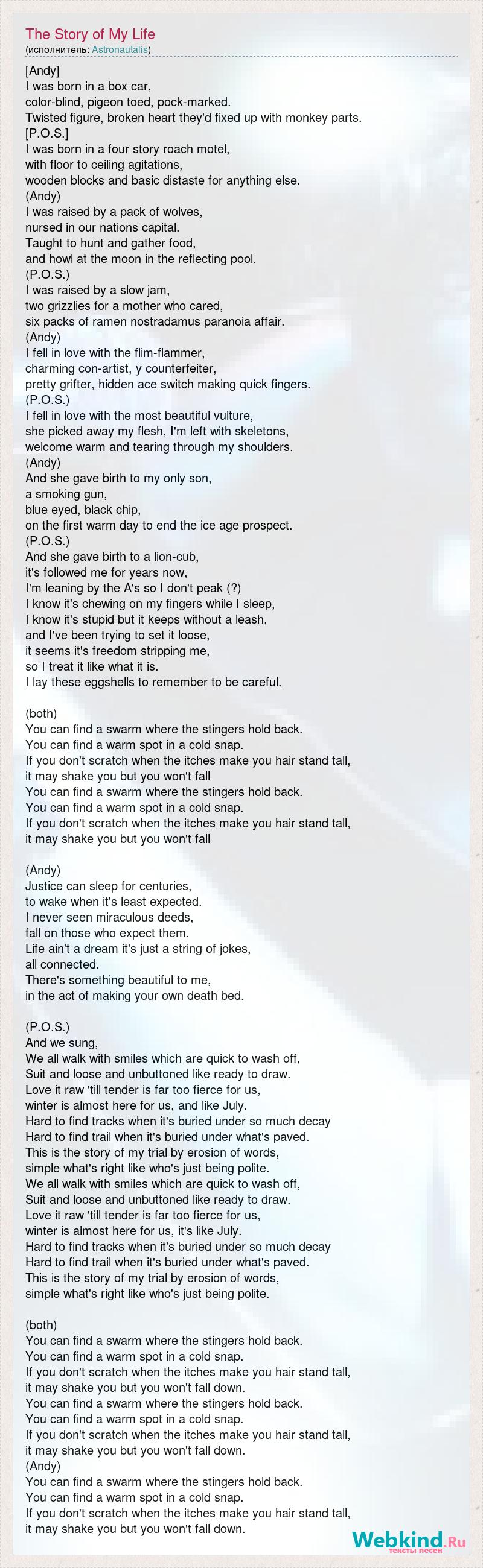 [Andy] I was born in a box car, color-blind, pigeon toed, pock-marked. Twisted figure, broken heart they'd fixed up with monkey parts. [P.O.S.] I was born in a four story roach motel, with floor to ceiling agitations, wooden blocks and basic distaste for anything else. (Andy) I was raised by a pack of wolves, nursed in our nations capital. Taught to hunt and gather food, and howl at the moon in the reflecting pool. (P.O.S.) I was raised by a slow jam, two grizzlies for a mother who cared, six packs of ramen nostradamus paranoia affair. (Andy) I fell in love with the flim-flammer, charming con-artist, y counterfeiter, pretty grifter, hidden ace switch making quick fingers. (P.O.S.) I fell in love with the most beautiful vulture, she picked away my flesh, I'm left with skeletons, welcome warm and tearing through my shoulders. (Andy) And she gave birth to my only son, a smoking gun, blue eyed, black chip, on the first warm day to end the ice age prospect. (P.O.S.) And she gave birth to a lion-cub, it's followed me for years now, I'm leaning by the A's so I don't peak (?) I know it's chewing on my fingers while I sleep, I know it's stupid but it keeps without a leash, and I've been trying to set it loose, it seems it's freedom stripping me, so I treat it like what it is. I lay these eggshells to remember to be careful. (both) You can find a swarm where the stingers hold back. You can find a warm spot in a cold snap. If you don't scratch when the itches make you hair stand tall, it may shake you but you won't fall You can find a swarm where the stingers hold back. You can find a warm spot in a cold snap. If you don't scratch when the itches make you hair stand tall, it may shake you but you won't fall (Andy) Justice can sleep for centuries, to wake when it's least expected. I never seen miraculous deeds, fall on those who expect them. Life ain't a dream it's just a string of jokes, all connected. There's something beautiful to me, in the act of making your own death bed. (P.O.S.) And we sung, We all walk with smiles which are quick to wash off, Suit and loose and unbuttoned like ready to draw. Love it raw 'till tender is far too fierce for us, winter is almost here for us, and like July. Hard to find tracks when it's buried under so much decay Hard to find trail when it's buried under what's paved. This is the story of my trial by erosion of words, simple what's right like who's just being polite. We all walk with smiles which are quick to wash off, Suit and loose and unbuttoned like ready to draw. Love it raw 'till tender is far too fierce for us, winter is almost here for us, it's like July. Hard to find tracks when it's buried under so much decay Hard to find trail when it's buried under what's paved. This is the story of my trial by erosion of words, simple what's right like who's just being polite. (both) You can find a swarm where the stingers hold back. You can find a warm spot in a cold snap. If you don't scratch when the itches make you hair stand tall, it may shake you but you won't fall down. You can find a swarm where the stingers hold back. You can find a warm spot in a cold snap. If you don't scratch when the itches make you hair stand tall, it may shake you but you won't fall down. (Andy) You can find a swarm where the stingers hold back. You can find a warm spot in a cold snap. If you don't scratch when the itches make you hair stand tall, it may shake you but you won't fall down.
