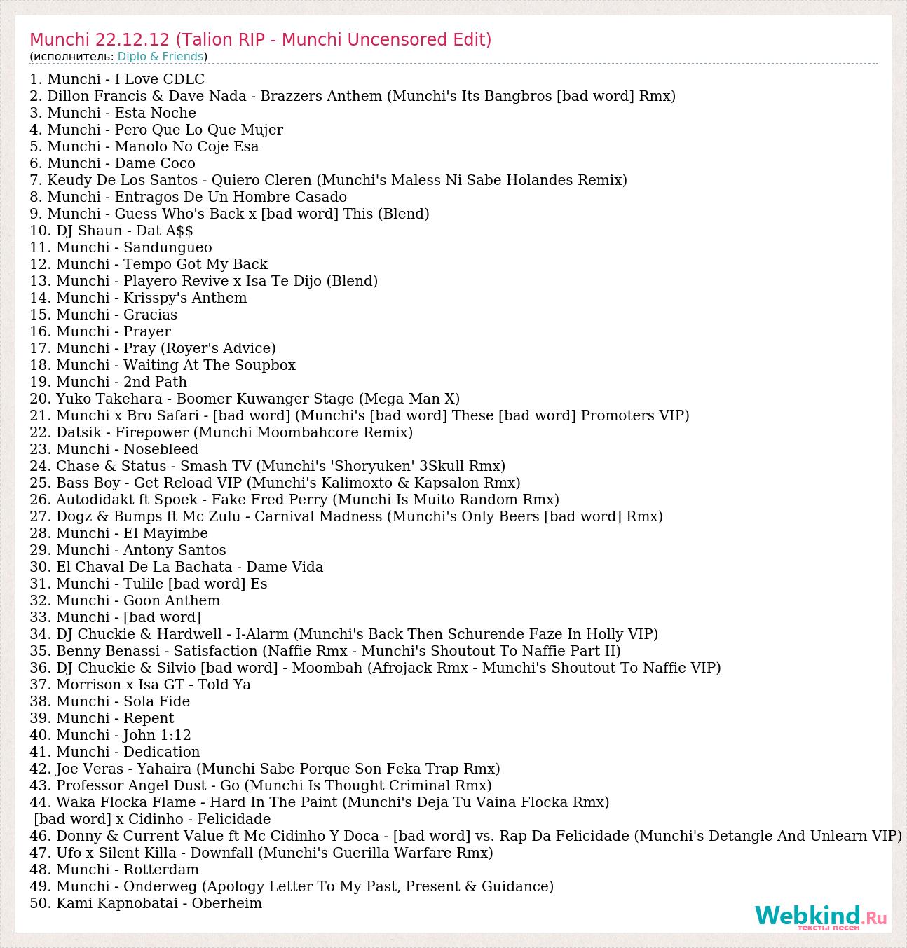 А как ты думаешь, о чем песня "Munchi 22.12.12 (Talion RIP - Munchi Uncensored Edit)" ?