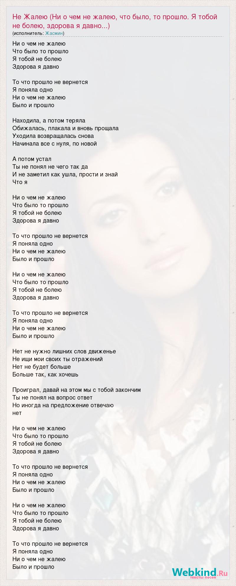 Ни о чем не жалею Что было то прошло Я тобой не болею Здорова я давно То что прошло не вернется Я поняла одно Ни о чем не жалею Было и прошло Находила, а потом теряла Обижалась, плакала и вновь прощала Уходила возвращалась снова Начинала все с нуля, по новой А потом устал Ты не понял не чего так да И не заметил как ушла, прости и знай Что я Ни о чем не жалею Что было то прошло Я тобой не болею Здорова я давно То что прошло не вернется Я поняла одно Ни о чем не жалею Было и прошло Ни о чем не жалею Что было то прошло Я тобой не болею Здорова я давно То что прошло не вернется Я поняла одно Ни о чем не жалею Было и прошло Нет не нужно лишних слов движенье Не ищи мои своих ты отражений Нет не будет больше Больше так, как хочешь Проиграл, давай на этом мы с тобой закончим Ты не понял на вопрос ответ Но иногда на предложение отвечаю нет Ни о чем не жалею Что было то прошло Я тобой не болею Здорова я давно То что прошло не вернется Я поняла одно Ни о чем не жалею Было и прошло Ни о чем не жалею Что было то прошло Я тобой не болею Здорова я давно То что прошло не вернется Я поняла одно Ни о чем не жалею Было и прошло