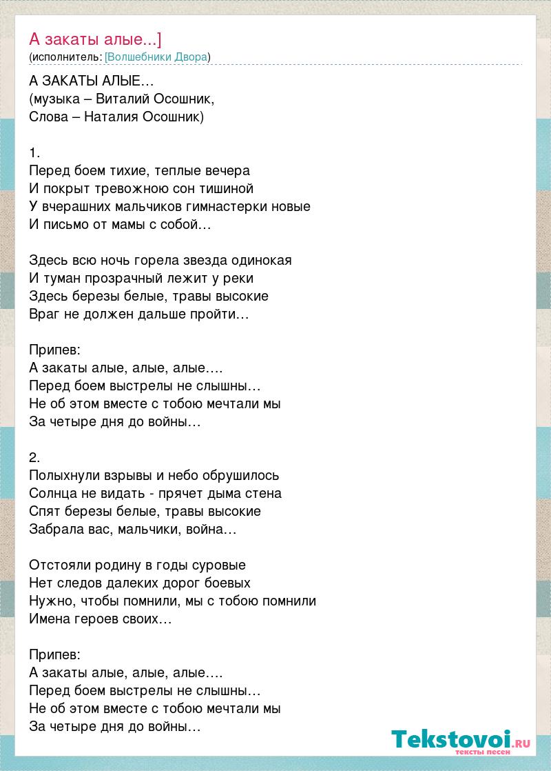А ЗАКАТЫ АЛЫЕ… (музыка – Виталий Осошник, Слова – Наталия Осошник) 1. Перед боем тихие, теплые вечера И покрыт тревожною сон тишиной У вчерашних мальчиков гимнастерки новые И письмо от мамы с собой… Здесь всю ночь горела звезда одинокая И туман прозрачный лежит у реки Здесь березы белые, травы высокие Враг не должен дальше пройти… Припев: А закаты алые, алые, алые…. Перед боем выстрелы не слышны… Не об этом вместе с тобою мечтали мы За четыре дня до войны… 2. Полыхнули взрывы и небо обрушилось Солнца не видать - прячет дыма стена Спят березы белые, травы высокие Забрала вас, мальчики, война… Отстояли родину в годы суровые Нет следов далеких дорог боевых Нужно, чтобы помнили, мы с тобою помнили Имена героев своих… Припев: А закаты алые, алые, алые…. Перед боем выстрелы не слышны… Не об этом вместе с тобою мечтали мы За четыре дня до войны…