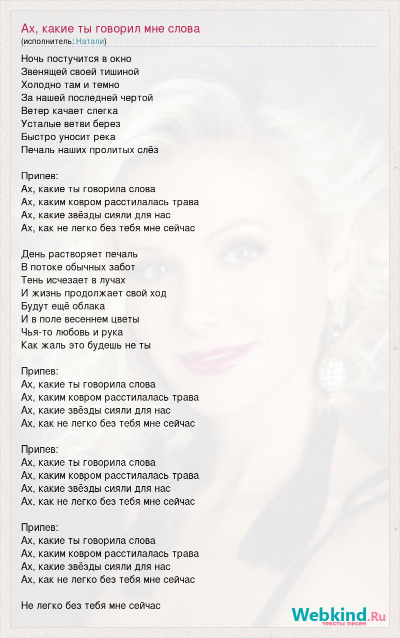 Ночь постучится в окно Звенящей своей тишиной Холодно там и темно За нашей последней чертой Ветер качает слегка Усталые ветви берез Быстро уносит река Печаль наших пролитых слёз Припев: Ах, какие ты говорила слова Ах, каким ковром расстилалась трава Ах, какие звёзды сияли для нас Ах, как не легко без тебя мне сейчас День растворяет печаль В потоке обычных забот Тень исчезает в лучах И жизнь продолжает свой ход Будут ещё облака И в поле весеннем цветы Чья-то любовь и рука Как жаль это будешь не ты Припев: Ах, какие ты говорила слова Ах, каким ковром расстилалась трава Ах, какие звёзды сияли для нас Ах, как не легко без тебя мне сейчас Припев: Ах, какие ты говорила слова Ах, каким ковром расстилалась трава Ах, какие звёзды сияли для нас Ах, как не легко без тебя мне сейчас Припев: Ах, какие ты говорила слова Ах, каким ковром расстилалась трава Ах, какие звёзды сияли для нас Ах, как не легко без тебя мне сейчас Не легко без тебя мне сейчас