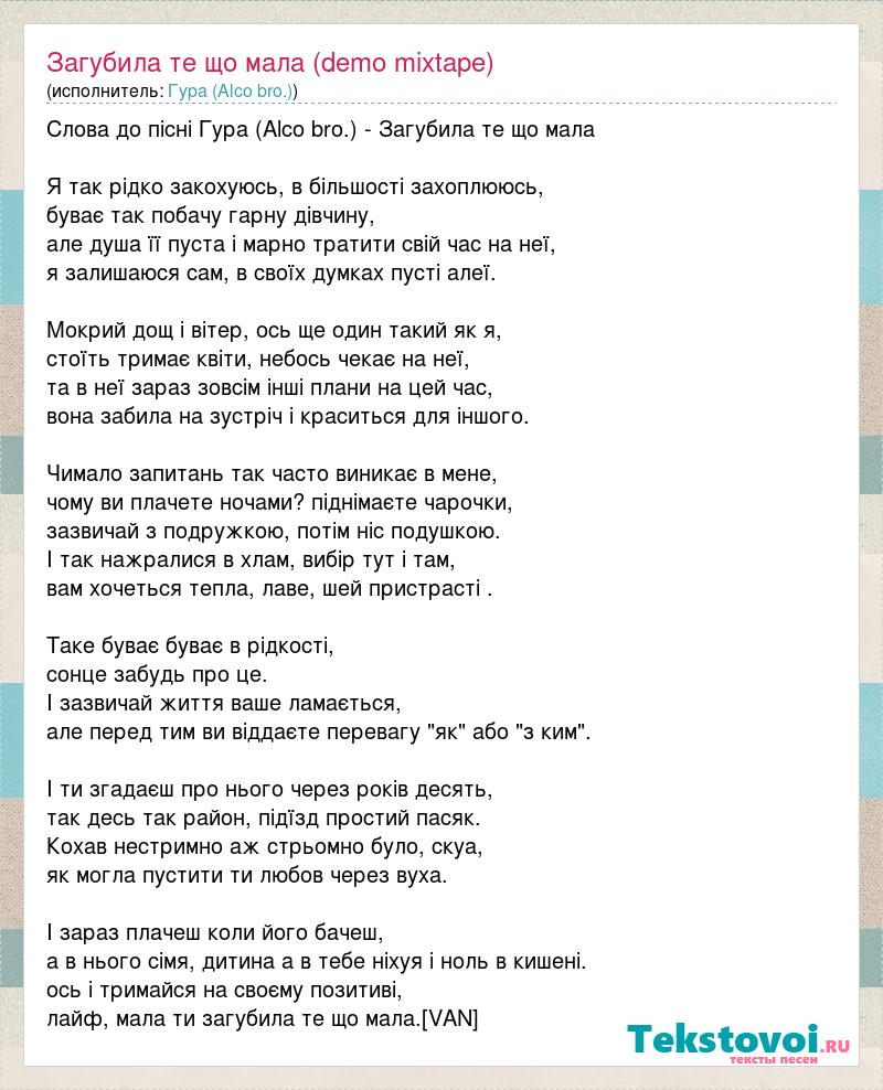 Слова до пісні Гура (Alco bro.) - Загубила те що мала Я так рідко закохуюсь, в більшості захоплююсь, буває так побачу гарну дівчину, але душа її пуста і марно тратити свій час на неї, я залишаюся сам, в своїх думках пусті алеї. Мокрий дощ і вітер, ось ще один такий як я, стоїть тримає квіти, небось чекає на неї, та в неї зараз зовсім інші плани на цей час, вона забила на зустріч і краситься для іншого. Чимало запитань так часто виникає в мене, чому ви плачете ночами? піднімаєте чарочки, зазвичай з подружкою, потім ніс подушкою. І так нажралися в хлам, вибір тут і там, вам хочеться тепла, лаве, шей пристрасті . Таке буває буває в рідкості, сонце забудь про це. І зазвичай життя ваше ламається, але перед тим ви віддаєте перевагу "як" або "з ким". І ти згадаєш про нього через років десять, так десь так район, підїзд простий пасяк. Кохав нестримно аж стрьомно було, скуа, як могла пустити ти любов через вуха. І зараз плачеш коли його бачеш, а в нього сімя, дитина а в тебе ніхуя і ноль в кишені. ось і тримайся на своєму позитиві, лайф, мала ти загубила те що мала.[VAN]