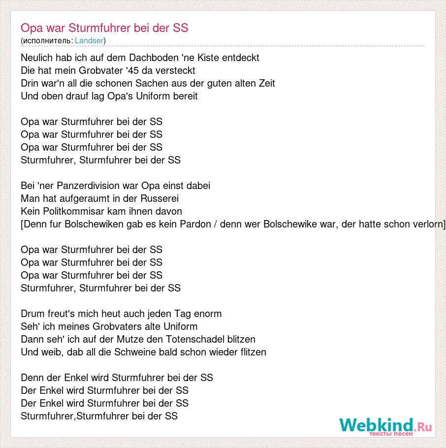Neulich hab ich auf dem Dachboden 'ne Kiste entdeckt Die hat mein Grobvater '45 da versteckt Drin war'n all die schonen Sachen aus der guten alten Zeit Und oben drauf lag Opa's Uniform bereit Opa war Sturmfuhrer bei der SS Opa war Sturmfuhrer bei der SS Opa war Sturmfuhrer bei der SS Sturmfuhrer, Sturmfuhrer bei der SS Bei 'ner Panzerdivision war Opa einst dabei Man hat aufgeraumt in der Russerei Kein Politkommisar kam ihnen davon [Denn fur Bolschewiken gab es kein Pardon / denn wer Bolschewike war, der hatte schon verlorn] Opa war Sturmfuhrer bei der SS Opa war Sturmfuhrer bei der SS Opa war Sturmfuhrer bei der SS Sturmfuhrer, Sturmfuhrer bei der SS Drum freut's mich heut auch jeden Tag enorm Seh' ich meines Grobvaters alte Uniform Dann seh' ich auf der Mutze den Totenschadel blitzen Und weib, dab all die Schweine bald schon wieder flitzen Denn der Enkel wird Sturmfuhrer bei der SS Der Enkel wird Sturmfuhrer bei der SS Der Enkel wird Sturmfuhrer bei der SS Sturmfuhrer,Sturmfuhrer bei der SS
