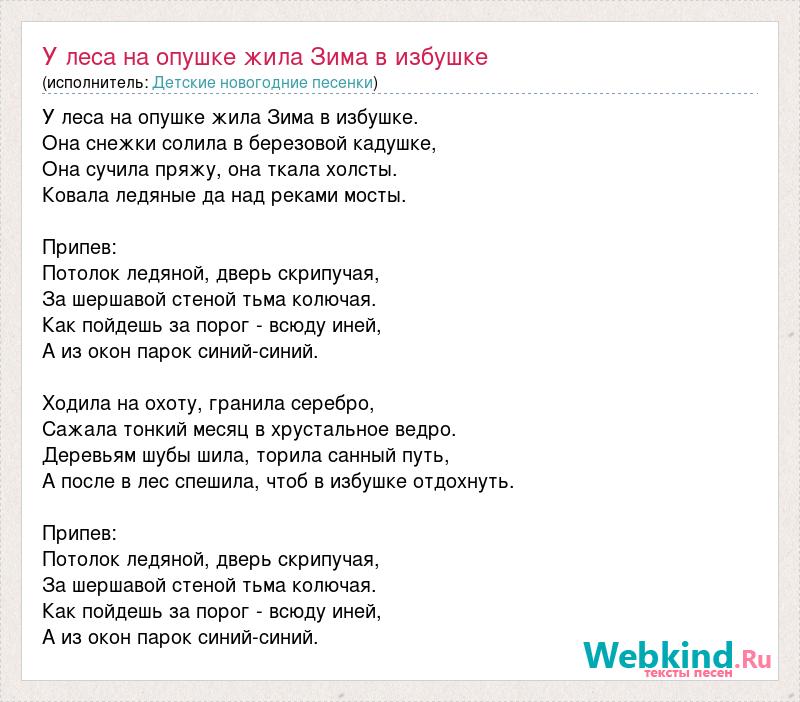 У леса на опушке жила Зима в избушке. Она снежки солила в березовой кадушке, Она сучила пряжу, она ткала холсты. Ковала ледяные да над реками мосты. Припев: Потолок ледяной, дверь скрипучая, За шершавой стеной тьма колючая. Как пойдешь за порог - всюду иней, А из окон парок синий-синий. Ходила на охоту, гранила серебро, Сажала тонкий месяц в хрустальное ведро. Деревьям шубы шила, торила санный путь, А после в лес спешила, чтоб в избушке отдохнуть. Припев: Потолок ледяной, дверь скрипучая, За шершавой стеной тьма колючая. Как пойдешь за порог - всюду иней, А из окон парок синий-синий.