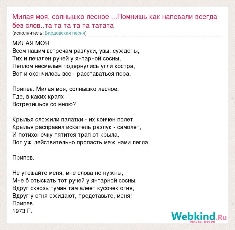 МИЛАЯ МОЯ Всем нашим встречам разлуки, увы, суждены, Тих и печален ручей у янтарной сосны, Пеплом несмелым подернулись угли костра, Вот и окончилось все - расставаться пора. Припев: Милая моя, солнышко лесное, Где, в каких краях Встретишься со мною? Крылья сложили палатки - их кончен полет, Крылья расправил искатель разлук - самолет, И потихонечку пятится трап от крыла, Вот уж действительно пропасть меж нами легла. Припев. Не утешайте меня, мне слова не нужны, Мне б отыскать тот ручей у янтарной сосны, Вдруг сквозь туман там алеет кусочек огня, Вдруг у огня ожидают, представьте, меня! Припев. 1973 Г.