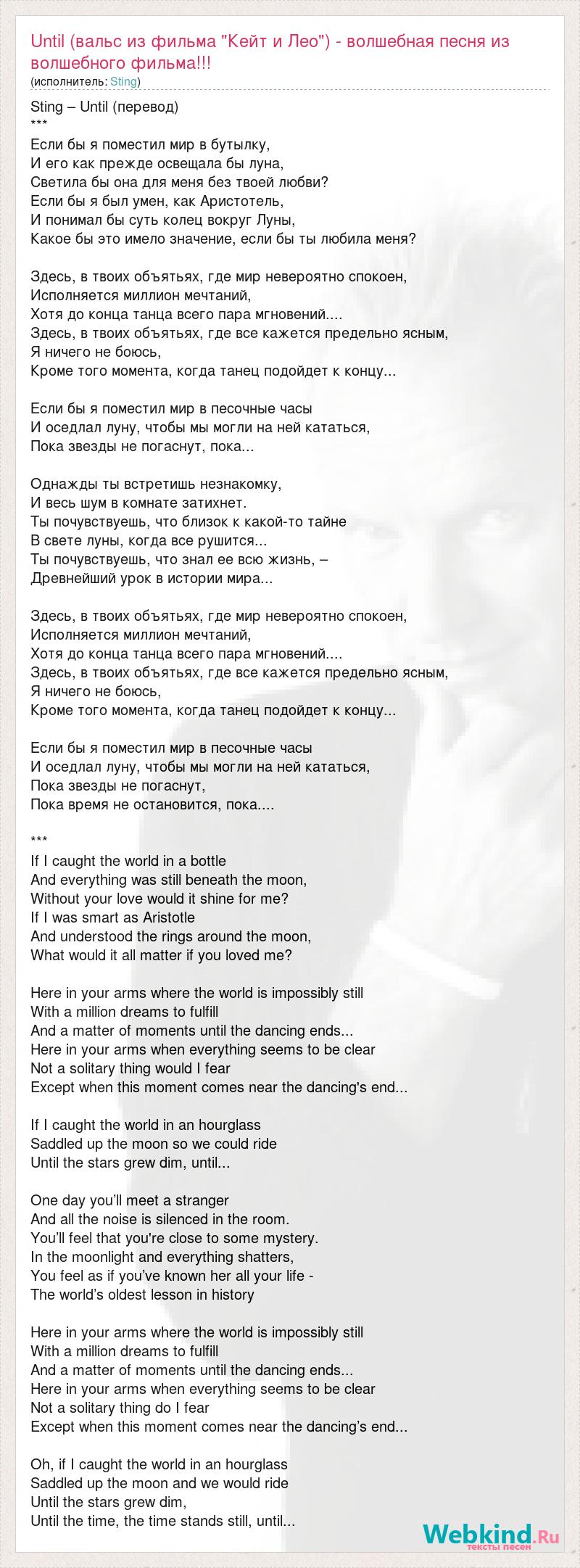 Sting – Until (перевод) *** Если бы я поместил мир в бутылку, И его как прежде освещала бы луна, Светила бы она для меня без твоей любви? Если бы я был умен, как Аристотель, И понимал бы суть колец вокруг Луны, Какое бы это имело значение, если бы ты любила меня? Здесь, в твоих объятьях, где мир невероятно спокоен, Исполняется миллион мечтаний, Хотя до конца танца всего пара мгновений.... Здесь, в твоих объятьях, где все кажется предельно ясным, Я ничего не боюсь, Кроме того момента, когда танец подойдет к концу... Если бы я поместил мир в песочные часы И оседлал луну, чтобы мы могли на ней кататься, Пока звезды не погаснут, пока... Однажды ты встретишь незнакомку, И весь шум в комнате затихнет. Ты почувствуешь, что близок к какой-то тайне В свете луны, когда все рушится... Ты почувствуешь, что знал ее всю жизнь, – Древнейший урок в истории мира... Здесь, в твоих объятьях, где мир невероятно спокоен, Исполняется миллион мечтаний, Хотя до конца танца всего пара мгновений.... Здесь, в твоих объятьях, где все кажется предельно ясным, Я ничего не боюсь, Кроме того момента, когда танец подойдет к концу... Если бы я поместил мир в песочные часы И оседлал луну, чтобы мы могли на ней кататься, Пока звезды не погаснут, Пока время не остановится, пока.... *** If I caught the world in a bottle And everything was still beneath the moon, Without your love would it shine for me? If I was smart as Aristotle And understood the rings around the moon, What would it all matter if you loved me? Here in your arms where the world is impossibly still With a million dreams to fulfill And a matter of moments until the dancing ends... Here in your arms when everything seems to be clear Not a solitary thing would I fear Except when this moment comes near the dancing's end... If I caught the world in an hourglass Saddled up the moon so we could ride Until the stars grew dim, until... One day you’ll meet a stranger And all the noise is silenced in the room. You’ll feel that you're close to some mystery. In the moonlight and everything shatters, You feel as if you’ve known her all your life - The world’s oldest lesson in history Here in your arms where the world is impossibly still With a million dreams to fulfill And a matter of moments until the dancing ends... Here in your arms when everything seems to be clear Not a solitary thing do I fear Except when this moment comes near the dancing’s end... Oh, if I caught the world in an hourglass Saddled up the moon and we would ride Until the stars grew dim, Until the time, the time stands still, until...