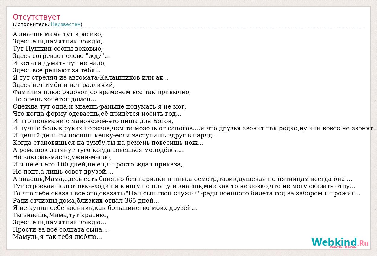 А знаешь мама тут красиво, Здесь ели,памятник вождю, Тут Пушкин сосны вековые, Здесь согревает слово-"жду"... И кстати думать тут не надо, Здесь все решают за тебя... Я тут стрелял из автомата-Калашников или ак... Здесь нет имён и нет различий, Фамилия плюс рядовой,со временем все так привычно, Но очень хочется домой... Одежда тут одна,и знаешь-раньше подумать я не мог, Что когда форму одеваешь,её придётся носить год... И что пельмени с майонезом-это пища для Богов, И лучше боль в руках порезов,чем та мозоль от сапогов....и что друзья звонит так редко,ну или вовсе не звонят.. И целый день ты носишь кепку-если заступишь вдруг в наряд... Когда становишься на тумбу,ты на ремень повесишь нож... А ремешок затянут туго-когда зовёшься молодёжь.... На завтрак-масло,ужин-масло, И я не ел его 100 дней,не ел,я просто ждал приказа, Не понт,а лишь совет друзей.... А знаешь,Мама,здесь есть баня,но без парилки и пивка-осмотр,тазик,душевая-по пятницам всегда она.... Тут строевая подготовка-ходил я в ногу по плацу и знаешь,мне как то не ловко,что не могу сказать отцу... То что тебе сказал всё это,сказать:"Пап,сын твой служил"-ради военного билета год за забором я прожил... Ради отчизны,дома,близких отдал 365 дней... Я не купил себе военник,как большинство моих друзей... Ты знаешь,Мама,тут красиво, Здесь ели,памятник вождю... Прости за всё солдата сына.... Мамуль,я так тебя люблю...