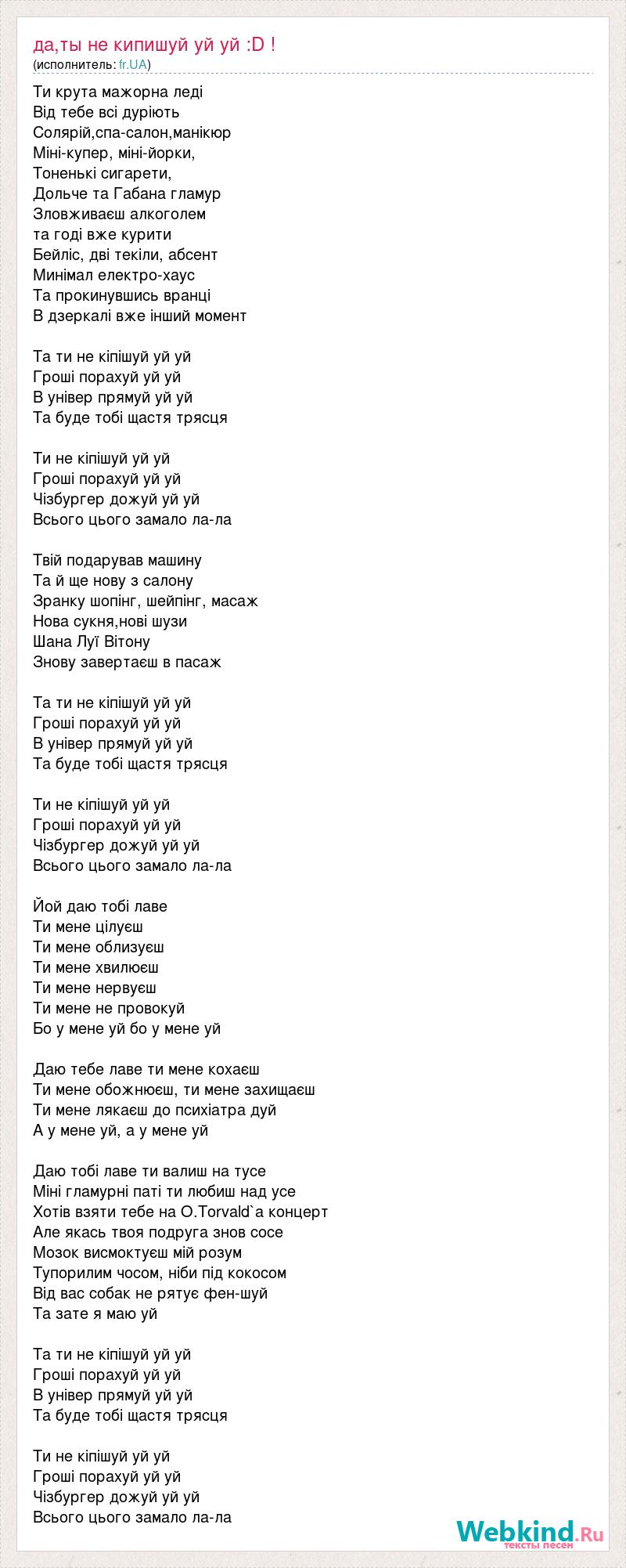 Ти крута мажорна леді Від тебе всі дуріють Солярій,спа-салон,манікюр Міні-купер, міні-йорки, Тоненькі сигарети, Дольче та Габана гламур Зловживаєш алкоголем та годі вже курити Бейліс, дві текіли, абсент Минімал електро-хаус Та прокинувшись вранці В дзеркалі вже інший момент Та ти не кіпішуй уй уй Гроші порахуй уй уй В універ прямуй уй уй Та буде тобі щастя трясця Ти не кіпішуй уй уй Гроші порахуй уй уй Чізбургер дожуй уй уй Всього цього замало ла-ла Твій подарував машину Та й ще нову з салону Зранку шопінг, шейпінг, масаж Нова сукня,нові шузи Шана Луї Вітону Знову завертаєш в пасаж Та ти не кіпішуй уй уй Гроші порахуй уй уй В універ прямуй уй уй Та буде тобі щастя трясця Ти не кіпішуй уй уй Гроші порахуй уй уй Чізбургер дожуй уй уй Всього цього замало ла-ла Йой даю тобі лаве Ти мене цілуєш Ти мене облизуєш Ти мене хвилюєш Ти мене нервуєш Ти мене не провокуй Бо у мене уй бо у мене уй Даю тебе лаве ти мене кохаєш Ти мене обожнюєш, ти мене захищаєш Ти мене лякаєш до психіатра дуй А у мене уй, а у мене уй Даю тобі лаве ти валиш на тусе Міні гламурні паті ти любиш над усе Хотів взяти тебе на O.Torvald`a концерт Але якась твоя подруга знов сосе Мозок висмоктуєш мій розум Тупорилим чосом, ніби під кокосом Від вас собак не рятує фен-шуй Та зате я маю уй Та ти не кіпішуй уй уй Гроші порахуй уй уй В універ прямуй уй уй Та буде тобі щастя трясця Ти не кіпішуй уй уй Гроші порахуй уй уй Чізбургер дожуй уй уй Всього цього замало ла-ла