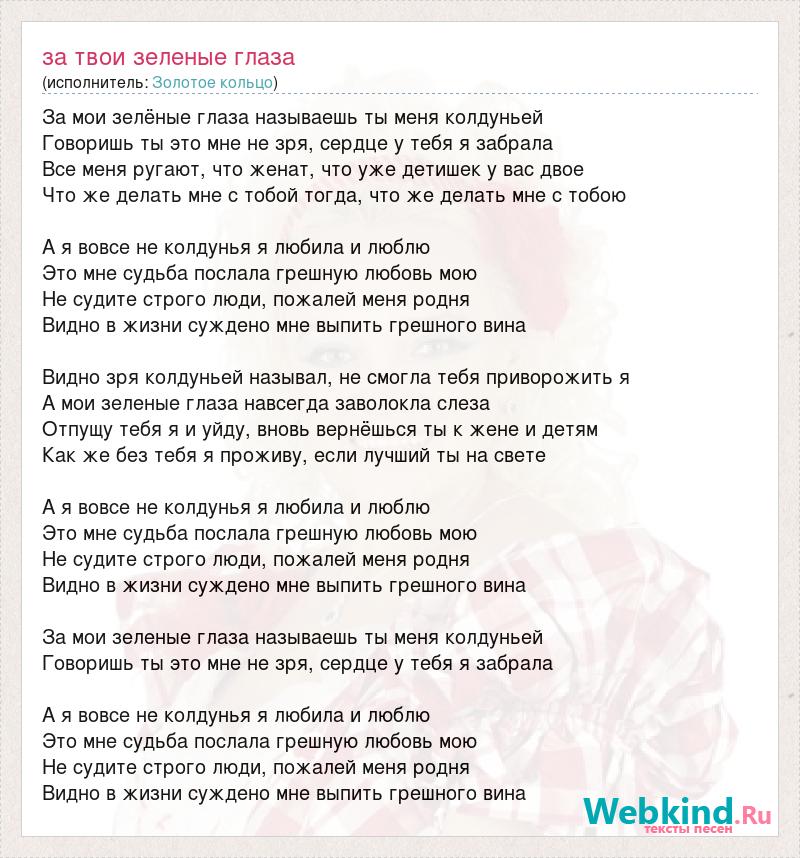 За мои зелёные глаза называешь ты меня колдуньей Говоришь ты это мне не зря, сердце у тебя я забрала Все меня ругают, что женат, что уже детишек у вас двое Что же делать мне с тобой тогда, что же делать мне с тобою А я вовсе не колдунья я любила и люблю Это мне судьба послала грешную любовь мою Не судите строго люди, пожалей меня родня Видно в жизни суждено мне выпить грешного вина Видно зря колдуньей называл, не смогла тебя приворожить я А мои зеленые глаза навсегда заволокла слеза Отпущу тебя я и уйду, вновь вернёшься ты к жене и детям Как же без тебя я проживу, если лучший ты на свете А я вовсе не колдунья я любила и люблю Это мне судьба послала грешную любовь мою Не судите строго люди, пожалей меня родня Видно в жизни суждено мне выпить грешного вина За мои зеленые глаза называешь ты меня колдуньей Говоришь ты это мне не зря, сердце у тебя я забрала А я вовсе не колдунья я любила и люблю Это мне судьба послала грешную любовь мою Не судите строго люди, пожалей меня родня Видно в жизни суждено мне выпить грешного вина