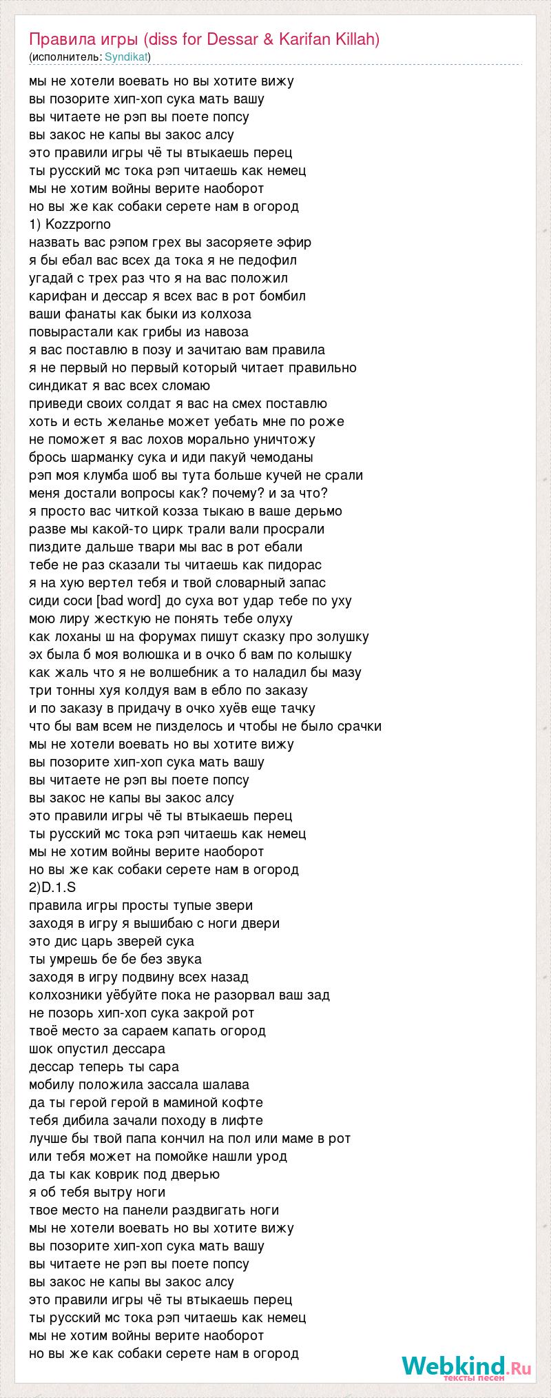 мы не хотели воевать но вы хотите вижу вы позорите хип-хоп сука мать вашу вы читаете не рэп вы поете попсу вы закос не капы вы закос алсу это правили игры чё ты втыкаешь перец ты русский мс тока рэп читаешь как немец мы не хотим войны верите наоборот но вы же как собаки серете нам в огород 1) Kozzporno назвать вас рэпом грех вы засоряете эфир я бы ебал вас всех да тока я не педофил угадай с трех раз что я на вас положил карифан и дессар я всех вас в рот бомбил ваши фанаты как быки из колхоза повырастали как грибы из навоза я вас поставлю в позу и зачитаю вам правила я не первый но первый который читает правильно синдикат я вас всех сломаю приведи своих солдат я вас на смех поставлю хоть и есть желанье может уебать мне по роже не поможет я вас лохов морально уничтожу брось шарманку сука и иди пакуй чемоданы рэп моя клумба шоб вы тута больше кучей не срали меня достали вопросы как? почему? и за что? я просто вас читкой козза тыкаю в ваше дерьмо разве мы какой-то цирк трали вали просрали пиздите дальше твари мы вас в рот ебали тебе не раз сказали ты читаешь как пидорас я на хую вертел тебя и твой словарный запас сиди соси [bad word] до суха вот удар тебе по уху мою лиру жесткую не понять тебе олуху как лоханы ш на форумах пишут сказку про золушку эх была б моя волюшка и в очко б вам по колышку как жаль что я не волшебник а то наладил бы мазу три тонны хуя колдуя вам в ебло по заказу и по заказу в придачу в очко хуёв еще тачку что бы вам всем не пизделось и чтобы не было срачки мы не хотели воевать но вы хотите вижу вы позорите хип-хоп сука мать вашу вы читаете не рэп вы поете попсу вы закос не капы вы закос алсу это правили игры чё ты втыкаешь перец ты русский мс тока рэп читаешь как немец мы не хотим войны верите наоборот но вы же как собаки серете нам в огород 2)D.1.S правила игры просты тупые звери заходя в игру я вышибаю с ноги двери это дис царь зверей сука ты умрешь бе бе без звука заходя в игру подвину всех назад колхозники уёбуйте пока не разорвал ваш зад не позорь хип-хоп сука закрой рот твоё место за сараем капать огород шок опустил дессара дессар теперь ты сара мобилу положила зассала шалава да ты герой герой в маминой кофте тебя дибила зачали походу в лифте лучше бы твой папа кончил на пол или маме в рот или тебя может на помойке нашли урод да ты как коврик под дверью я об тебя вытру ноги твое место на панели раздвигать ноги мы не хотели воевать но вы хотите вижу вы позорите хип-хоп сука мать вашу вы читаете не рэп вы поете попсу вы закос не капы вы закос алсу это правили игры чё ты втыкаешь перец ты русский мс тока рэп читаешь как немец мы не хотим войны верите наоборот но вы же как собаки серете нам в огород