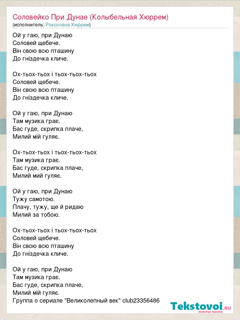 Ой у гаю, при Дунаю Соловей щебече. Він свою всю пташину До гніздечка кличе. Ох-тьох-тьох і тьох-тьох-тьох Соловей щебече. Він свою всю пташину До гніздечка кличе. Ой у гаю, при Дунаю Там музика грає. Бас гуде, скрипка плаче, Милий мій гуляє. Ох-тьох-тьох і тьох-тьох-тьох Там музика грає. Бас гуде, скрипка плаче, Милий мий гуляє. Ой у гаю, при Дунаю Тужу самотою. Плачу, тужу, ще й ридаю Милий за тобою. Ох-тьох-тьох і тьох-тьох-тьох Соловей щебече. Він свою всю пташину До гніздечка кличе. Ой у гаю, при Дунаю Там музика грає. Бас гуде, скрипка плаче, Милий мій гуляє. Группа о сериале "Великолепный век" club23356486