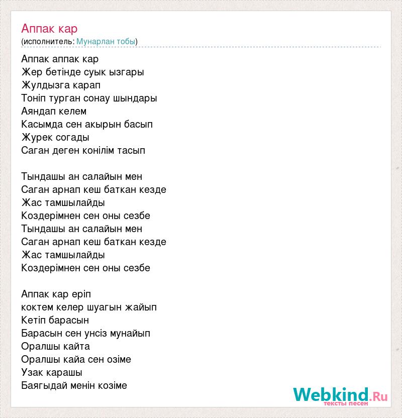 Аппак аппак кар Жер бетiнде суык ызгары Жулдызга карап Тонiп турган сонау шындары Аяндап келем Касымда сен акырын басып Журек согады Саган деген конiлiм тасып Тындашы ан салайын мен Саган арнап кеш баткан кезде Жас тамшылайды Коздерiмнен сен оны сезбе Тындашы ан салайын мен Саган арнап кеш баткан кезде Жас тамшылайды Коздерiмнен сен оны сезбе Аппак кар ерiп коктем келер шуагын жайып Кетiп барасын Барасын сен унсiз мунайып Оралшы кайта Оралшы кайа сен озiме Узак карашы Баягыдай менiн козiме