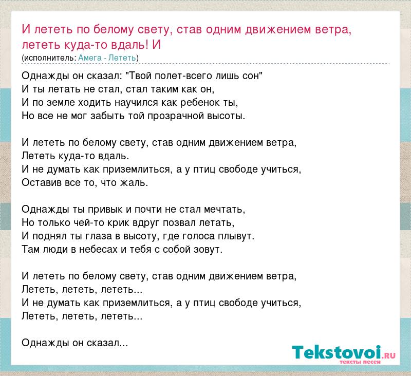 Однажды он сказал: "Твой полет-всего лишь сон" И ты летать не стал, стал таким как он, И по земле ходить научился как ребенок ты, Но все не мог забыть той прозрачной высоты. И лететь по белому свету, став одним движением ветра, Лететь куда-то вдаль. И не думать как приземлиться, а у птиц свободе учиться, Оставив все то, что жаль. Однажды ты привык и почти не стал мечтать, Но только чей-то крик вдруг позвал летать, И поднял ты глаза в высоту, где голоса плывут. Там люди в небесах и тебя с собой зовут. И лететь по белому свету, став одним движением ветра, Лететь, лететь, лететь... И не думать как приземлиться, а у птиц свободе учиться, Лететь, лететь, лететь... Однажды он сказал...