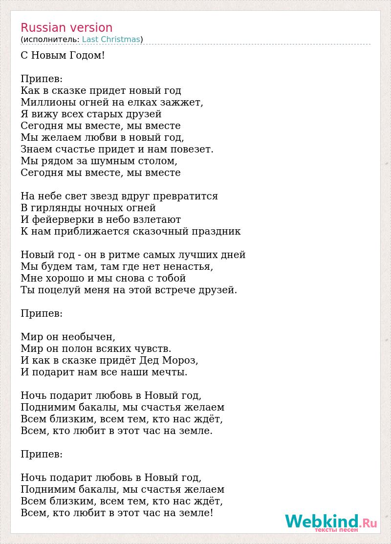 С Новым Годом! Припев: Как в сказке придет новый год Миллионы огней на елках зажжет, Я вижу всех старых друзей Сегодня мы вместе, мы вместе Мы желаем любви в новый год, Знаем счастье придет и нам повезет. Мы рядом за шумным столом, Сегодня мы вместе, мы вместе На небе свет звезд вдруг превратится В гирлянды ночных огней И фейерверки в небо взлетают К нам приближается сказочный праздник Новый год - он в ритме самых лучших дней Мы будем там, там где нет ненастья, Мне хорошо и мы снова с тобой Ты поцелуй меня на этой встрече друзей. Припев: Мир он необычен, Мир он полон всяких чувств. И как в сказке придёт Дед Мороз, И подарит нам все наши мечты. Ночь подарит любовь в Новый год, Поднимим бакалы, мы счастья желаем Всем близким, всем тем, кто нас ждёт, Всем, кто любит в этот час на земле. Припев: Ночь подарит любовь в Новый год, Поднимим бакалы, мы счастья желаем Всем близким, всем тем, кто нас ждёт, Всем, кто любит в этот час на земле!