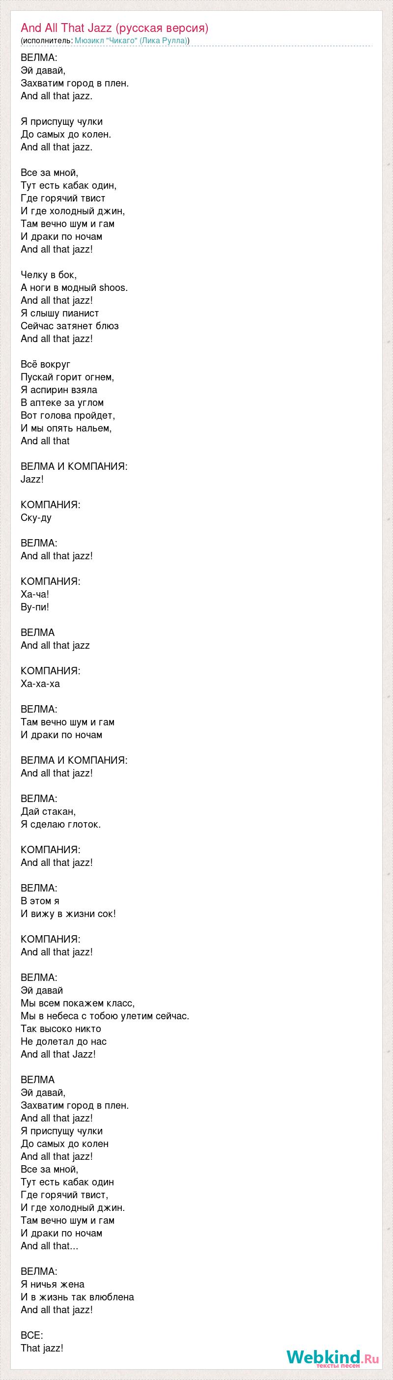 ВЕЛМА: Эй давай, Захватим город в плен. And all that jazz. Я приспущу чулки До самых до колен. And all that jazz. Все за мной, Тут есть кабак один, Где горячий твист И где холодный джин, Там вечно шум и гам И драки по ночам And all that jazz! Челку в бок, А ноги в модный shoos. And all that jazz! Я слышу пианист Сейчас затянет блюз And all that jazz! Всё вокруг Пускай горит огнем, Я аспирин взяла В аптеке за углом Вот голова пройдет, И мы опять нальем, And all that ВЕЛМА И КОМПАНИЯ: Jazz! КОМПАНИЯ: Ску-ду ВЕЛМА: And all that jazz! КОМПАНИЯ: Ха-ча! Ву-пи! ВЕЛМА And all that jazz КОМПАНИЯ: Ха-ха-ха ВЕЛМА: Там вечно шум и гам И драки по ночам ВЕЛМА И КОМПАНИЯ: And all that jazz! ВЕЛМА: Дай стакан, Я сделаю глоток. КОМПАНИЯ: And all that jazz! ВЕЛМА: В этом я И вижу в жизни сок! КОМПАНИЯ: And all that jazz! ВЕЛМА: Эй давай Мы всем покажем класс, Мы в небеса с тобою улетим сейчас. Так высоко никто Не долетал до нас And all that Jazz! ВЕЛМА Эй давай, Захватим город в плен. And all that jazz! Я приспущу чулки До самых до колен And all that jazz! Все за мной, Тут есть кабак один Где горячий твист, И где холодный джин. Там вечно шум и гам И драки по ночам And all that... ВЕЛМА: Я ничья жена И в жизнь так влюблена And all that jazz! ВСЕ: That jazz!