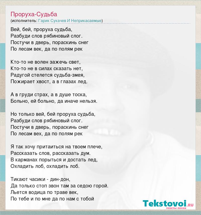 Вей, бей, проруха судьба, Разбуди слов рябиновый слог. Постучи в дверь, пораскинь снег По лесам век, да по полям рек Кто-то не волен зажечь свет, Кто-то не в силах сказать нет, Радугой стелется судьба-змея, Пожирает хвост, а в глазах лед. А в груди страх, а в душе тоска, Больно, ей больно, да иначе нельзя. Но только вей, бей проруха судьба, Разбуди слов рябиновый слог. Постучи в дверь, пораскинь снег По лесам вех, да по полям рек Я так хочу притаиться на твоем плече, Рассказать слов, рассказать дум. В карманах порыться и достать лед, Охладить лоб, охладить лоб. Тикают часики - дин-дон, Да только стоп звон там за седою горой. Льется водица по траве век, По тебе и по мне да по нам с тобой