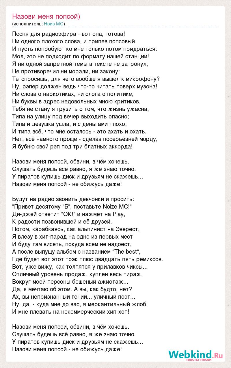 Песня для радиоэфира - вот она, готова! Ни одного плохого слова, и припев попсовый. И пусть попробуют ко мне только потом придраться: Мол, это не подходит по формату нашей станции! Я ни одной запретной темы в тексте не затронул, Не противоречил ни морали, ни закону: Ты спросишь, для чего вообще я вышел к микрофону? Ну, рэпер должен ведь что-то читать поверх музона! Ни слова о наркотиках, ни слога о политике, Ни буквы в адрес недовольных мною критиков. Тебя не стану я грузить о том, что жизнь ужасна, Типа на улицу под вечер выходить опасно; Типа и девушка ушла, и с деньгами плохо; И типа всё, что мне осталось - это ахать и охать. Нет, всё намного проще - сделав посерьёзней морду, Я бубню свой рэп под три блатных аккорда! Назови меня попсой, обвини, в чём хочешь. Слушать будешь всё равно, я же знаю точно. У пиратов купишь диск и друзьям не скажешь... Назови меня попсой - не обижусь даже! Будут на радио звонить девчонки и просить: "Привет десятому "Б", поставьте Noize MC!" Ди-джей ответит "ОК!" и нажмёт на Play, К радости позвонившей и её друзей. Потом, карабкаясь, как альпинист на Эверест, Я влезу в хит-парад на одно из первых мест И буду там висеть, покуда всем не надоест, А после выпущу альбом с названием "The best", Где будет вот этот трэк плюс двадцать пять ремиксов. Вот, уже вижу, как толпятся у прилавков чиксы... Отличный уровень продаж, куплен весь тираж, Вокруг моей персоны бешеный ажиотаж... Да, я мечтаю об этом. А вы, как будто, нет? Ах, вы непризнанный гений... уличный поэт... Ну, да, - куда мне до вас, я меркантильный жлоб. И мне плевать на некоммерческий хип-хоп! Назови меня попсой, обвини, в чём хочешь. Слушать будешь всё равно, я же знаю точно. У пиратов купишь диск и друзьям не скажешь... Назови меня попсой - не обижусь даже!