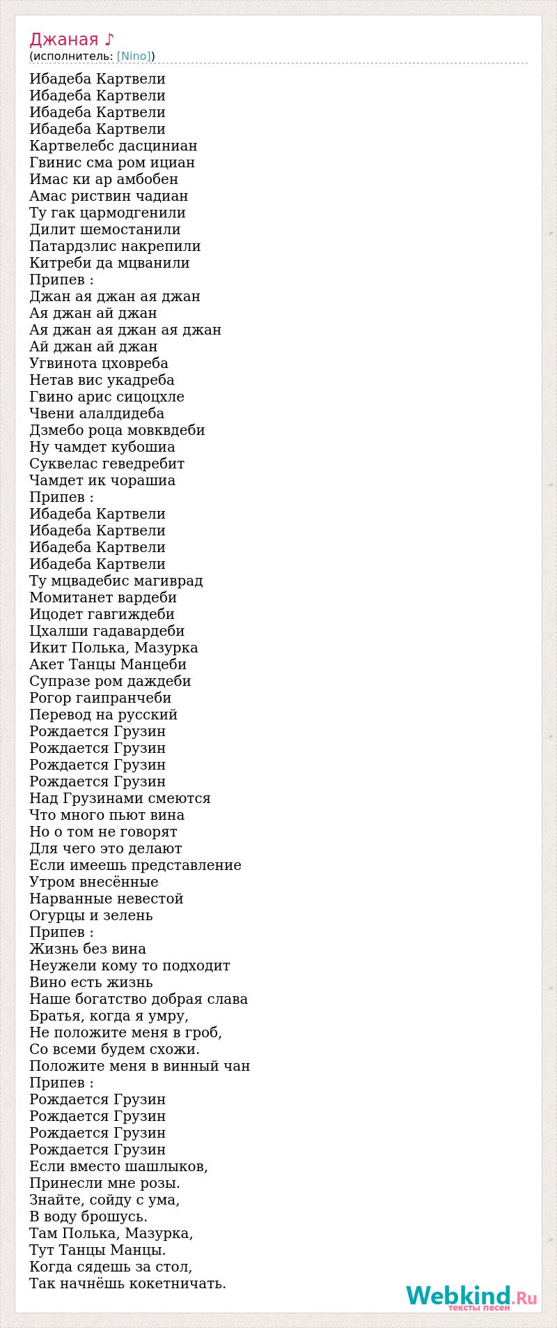 Ибадеба Картвели Ибадеба Картвели Ибадеба Картвели Ибадеба Картвели Картвелебс дасциниан Гвинис сма ром ициан Имас ки ар амбобен Амас риствин чадиан Ту гак цармодгенили Дилит шемостанили Патардзлис накрепили Китреби да мцванили Припев : Джан ая джан ая джан Ая джан ай джан Ая джан ая джан ая джан Ай джан ай джан Угвинота цховреба Нетав вис укадреба Гвино арис сицоцхле Чвени алалдидеба Дзмебо роца мовквдеби Ну чамдет кубошиа Суквелас геведребит Чамдет ик чорашиа Припев : Ибадеба Картвели Ибадеба Картвели Ибадеба Картвели Ибадеба Картвели Ту мцвадебис магиврад Момитанет вардеби Ицодет гавгиждеби Цхалши гадавардеби Икит Полька, Мазурка Акет Танцы Манцеби Супразе ром даждеби Рогор гаипранчеби Перевод на русский Рождается Грузин Рождается Грузин Рождается Грузин Рождается Грузин Над Грузинами смеются Что много пьют вина Но о том не говорят Для чего это делают Если имеешь представление Утром внесённые Нарванные невестой Огурцы и зелень Припев : Жизнь без вина Неужели кому то подходит Вино есть жизнь Наше богатство добрая слава Братья, когда я умру, Не положите меня в гроб, Со всеми будем схожи. Положите меня в винный чан Припев : Рождается Грузин Рождается Грузин Рождается Грузин Рождается Грузин Если вместо шашлыков, Принесли мне розы. Знайте, сойду с ума, В воду брошусь. Там Полька, Мазурка, Тут Танцы Манцы. Когда сядешь за стол, Так начнёшь кокетничать.