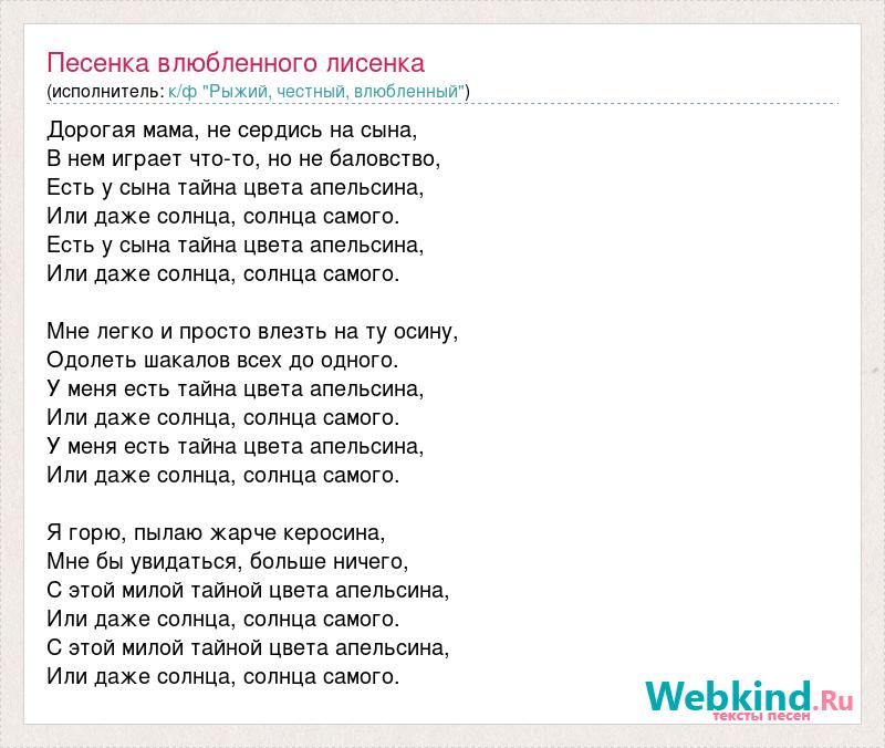 Дорогая мама, не сердись на сына, В нем играет что-то, но не баловство, Есть у сына тайна цвета апельсина, Или даже солнца, солнца самого. Есть у сына тайна цвета апельсина, Или даже солнца, солнца самого. Мне легко и просто влезть на ту осину, Одолеть шакалов всех до одного. У меня есть тайна цвета апельсина, Или даже солнца, солнца самого. У меня есть тайна цвета апельсина, Или даже солнца, солнца самого. Я горю, пылаю жарче керосина, Мне бы увидаться, больше ничего, С этой милой тайной цвета апельсина, Или даже солнца, солнца самого. С этой милой тайной цвета апельсина, Или даже солнца, солнца самого.
