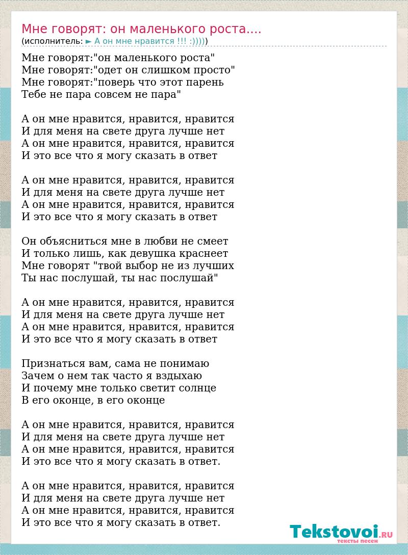 Мне говорят:"он маленького роста" Мне говорят:"одет он слишком просто" Мне говорят:"поверь что этот парень Тебе не пара совсем не пара" А он мне нравится, нравится, нравится И для меня на свете друга лучше нет А он мне нравится, нравится, нравится И это все что я могу сказать в ответ А он мне нравится, нравится, нравится И для меня на свете друга лучше нет А он мне нравится, нравится, нравится И это все что я могу сказать в ответ Он объясниться мне в любви не смеет И только лишь, как девушка краснеет Мне говорят "твой выбор не из лучших Ты нас послушай, ты нас послушай" А он мне нравится, нравится, нравится И для меня на свете друга лучше нет А он мне нравится, нравится, нравится И это все что я могу сказать в ответ Признаться вам, сама не понимаю Зачем о нем так часто я вздыхаю И почему мне только светит солнце В его оконце, в его оконце А он мне нравится, нравится, нравится И для меня на свете друга лучше нет А он мне нравится, нравится, нравится И это все что я могу сказать в ответ. А он мне нравится, нравится, нравится И для меня на свете друга лучше нет А он мне нравится, нравится, нравится И это все что я могу сказать в ответ.