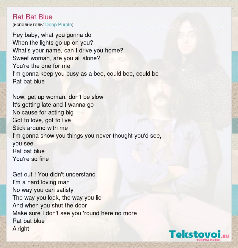 Hey baby, what you gonna do When the lights go up on you? What's your name, can I drive you home? Sweet woman, are you all alone? You're the one for me I'm gonna keep you busy as a bee, could bee, could be Rat bat blue Now, get up woman, don't be slow It's getting late and I wanna go No cause for acting big Got to love, got to live Stick around with me I'm gonna show you things you never thought you'd see, you see Rat bat blue You're so fine Get out ! You didn't understand I'm a hard loving man No way you can satisfy The way you look, the way you lie And when you shut the door Make sure I don't see you 'round here no more Rat bat blue Alright