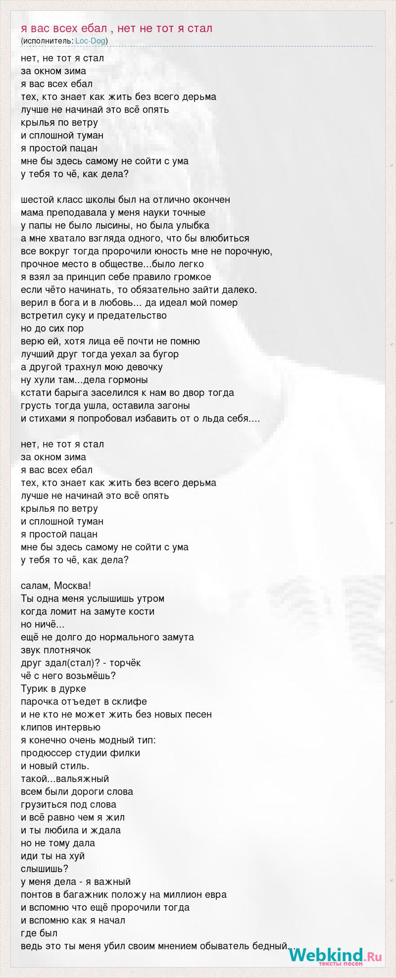 нет, не тот я стал за окном зима я вас всех ебал тех, кто знает как жить без всего дерьма лучше не начинай это всё опять крылья по ветру и сплошной туман я простой пацан мне бы здесь самому не сойти с ума у тебя то чё, как дела? шестой класс школы был на отлично окончен мама преподавала у меня науки точные у папы не было лысины, но была улыбка а мне хватало взгляда одного, что бы влюбиться все вокруг тогда пророчили юность мне не порочную, прочное место в обществе...было легко я взял за принцип себе правило громкое если чёто начинать, то обязательно зайти далеко. верил в бога и в любовь... да идеал мой помер встретил суку и предательство но до сих пор верю ей, хотя лица её почти не помню лучший друг тогда уехал за бугор а другой трахнул мою девочку ну хули там...дела гормоны кстати барыга заселился к нам во двор тогда грусть тогда ушла, оставила загоны и стихами я попробовал избавить от о льда себя.... нет, не тот я стал за окном зима я вас всех ебал тех, кто знает как жить без всего дерьма лучше не начинай это всё опять крылья по ветру и сплошной туман я простой пацан мне бы здесь самому не сойти с ума у тебя то чё, как дела? салам, Москва! Ты одна меня услышишь утром когда ломит на замуте кости но ничё... ещё не долго до нормального замута звук плотнячок друг здал(стал)? - торчёк чё с него возьмёшь? Турик в дурке парочка отъедет в склифе и не кто не может жить без новых песен клипов интервью я конечно очень модный тип: продюссер студии филки и новый стиль. такой...вальяжный всем были дороги слова грузиться под слова и всё равно чем я жил и ты любила и ждала но не тому дала иди ты на хуй слышишь? у меня дела - я важный понтов в багажник положу на миллион евра и вспомню что ещё пророчили тогда и вспомню как я начал где был ведь это ты меня убил своим мнением обыватель бедный...