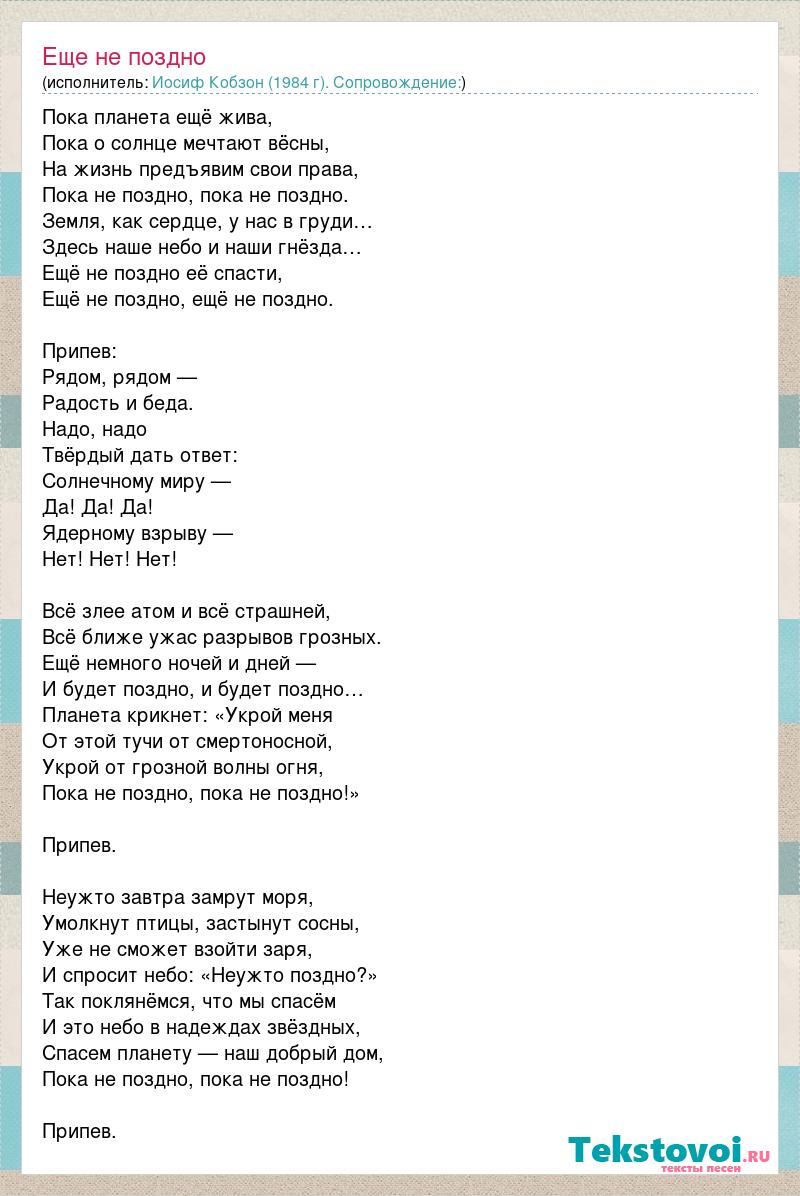 Пока планета ещё жива, Пока о солнце мечтают вёсны, На жизнь предъявим свои права, Пока не поздно, пока не поздно. Земля, как сердце, у нас в груди… Здесь наше небо и наши гнёзда… Ещё не поздно её спасти, Ещё не поздно, ещё не поздно. Припев: Рядом, рядом — Радость и беда. Надо, надо Твёрдый дать ответ: Солнечному миру — Да! Да! Да! Ядерному взрыву — Нет! Нет! Нет! Всё злее атом и всё страшней, Всё ближе ужас разрывов грозных. Ещё немного ночей и дней — И будет поздно, и будет поздно… Планета крикнет: «Укрой меня От этой тучи от смертоносной, Укрой от грозной волны огня, Пока не поздно, пока не поздно!» Припев. Неужто завтра замрут моря, Умолкнут птицы, застынут сосны, Уже не сможет взойти заря, И спросит небо: «Неужто поздно?» Так поклянёмся, что мы спасём И это небо в надеждах звёздных, Спасем планету — наш добрый дом, Пока не поздно, пока не поздно! Припев.
