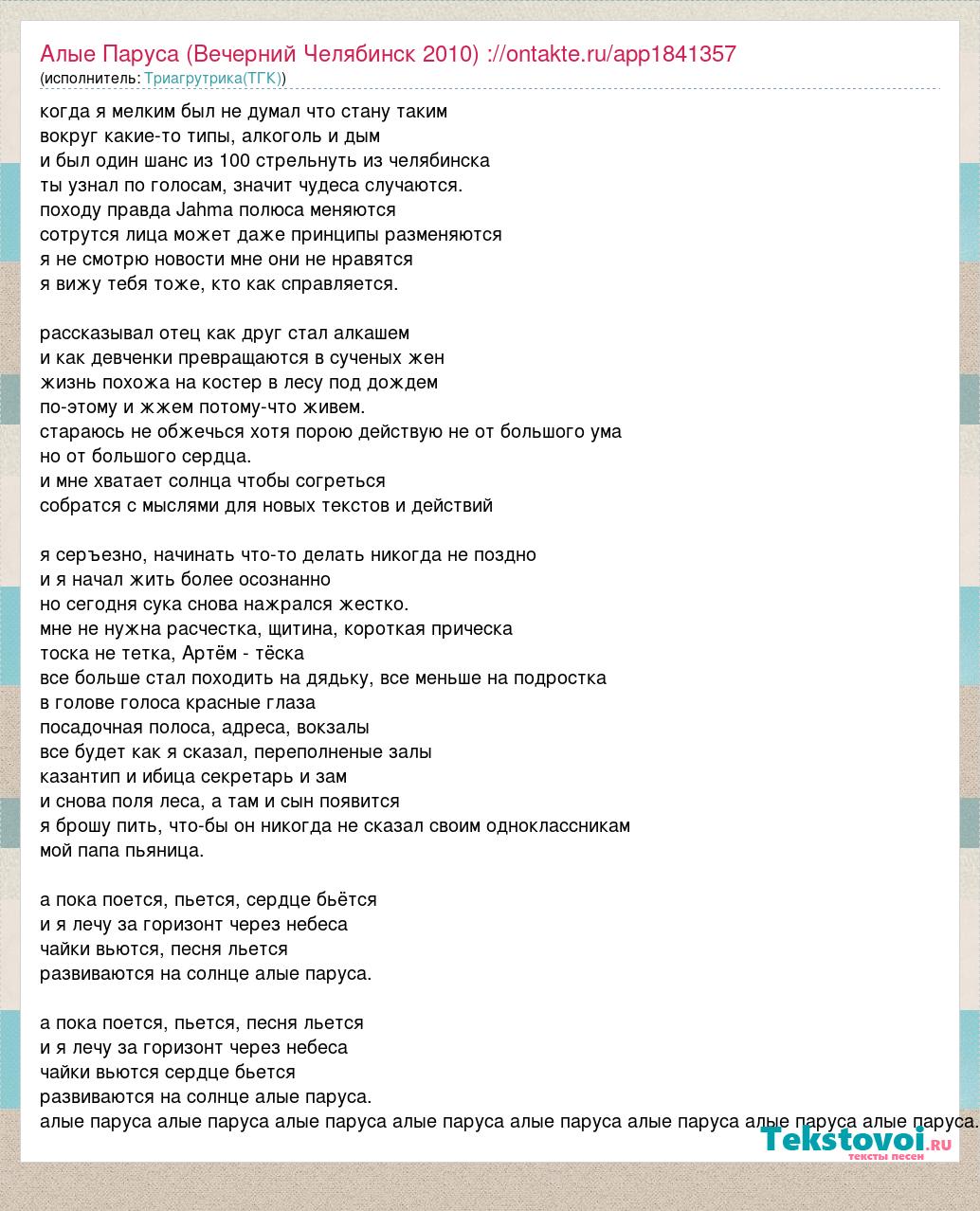 когда я мелким был не думал что стану таким вокруг какие-то типы, алкоголь и дым и был один шанс из 100 стрельнуть из челябинска ты узнал по голосам, значит чудеса случаются. походу правда Jahma полюса меняются сотрутся лица может даже принципы разменяются я не смотрю новости мне они не нравятся я вижу тебя тоже, кто как справляется. рассказывал отец как друг стал алкашем и как девченки превращаются в сученых жен жизнь похожа на костер в лесу под дождем по-этому и жжем потому-что живем. стараюсь не обжечься хотя порою действую не от большого ума но от большого сердца. и мне хватает солнца чтобы согреться собратся с мыслями для новых текстов и действий я серъезно, начинать что-то делать никогда не поздно и я начал жить более осознанно но сегодня сука снова нажрался жестко. мне не нужна расчестка, щитина, короткая прическа тоска не тетка, Артём - тёска все больше стал походить на дядьку, все меньше на подростка в голове голоса красные глаза посадочная полоса, адреса, вокзалы все будет как я сказал, переполненые залы казантип и ибица секретарь и зам и снова поля леса, а там и сын появится я брошу пить, что-бы он никогда не сказал своим одноклассникам мой папа пьяница. а пока поется, пьется, сердце бьётся и я лечу за горизонт через небеса чайки вьются, песня льется развиваются на солнце алые паруса. а пока поется, пьется, песня льется и я лечу за горизонт через небеса чайки вьются сердце бьется развиваются на солнце алые паруса. алые паруса алые паруса алые паруса алые паруса алые паруса алые паруса алые паруса алые паруса.