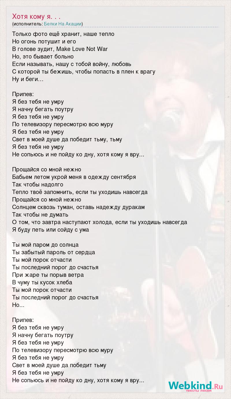 Только фото ещё хранит, наше тепло Но огонь потушит и его В голове зудит, Make Love Not War Но, это бывает больно Если называть, нашу с тобой войну, любовь С которой ты бежишь, чтобы попасть в плен к врагу Ну и беги… Припев: Я без тебя не умру Я начну бегать поутру Я без тебя не умру По телевизору пересмотрю всю муру Я без тебя не умру Свет в моей душе да победит тьму, тьму Я без тебя не умру Не сопьюсь и не пойду ко дну, хотя кому я вру... Прощайся со мной нежно Бабьем летом укрой меня в одежду сентября Так чтобы надолго Тепло твоё запомнить, если ты уходишь навсегда Прощайся со мной нежно Солнцем сквозь туман, оставь надежду дуракам Так чтобы не думать О том, что завтра наступают холода, если ты уходишь навсегда Я буду петь или сойду с ума Ты мой паром до солнца Ты забытый пароль от сердца Ты мой порок отчасти Ты последний порог до счастья При жаре ты порыв ветра В чуму ты кусок хлеба Ты мой порок отчасти Ты последний порог до счастья Но... Припев: Я без тебя не умру Я начну бегать поутру Я без тебя не умру По телевизору пересмотрю всю муру Я без тебя не умру Свет в моей душе да победит тьму Я без тебя не умру Не сопьюсь и не пойду ко дну, хотя кому я вру...