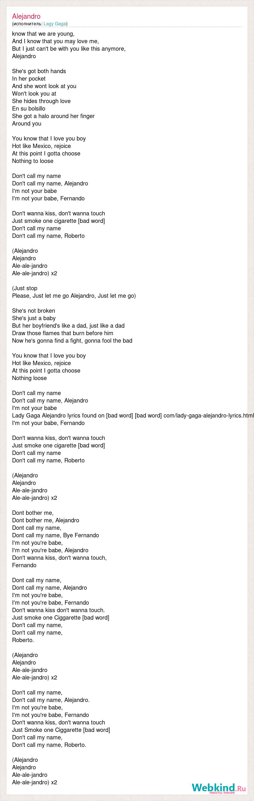 know that we are young, And I know that you may love me, But I just can't be with you like this anymore, Alejandro She's got both hands In her pocket And she wont look at you Won't look you at She hides through love En su bolsillo She got a halo around her finger Around you You know that I love you boy Hot like Mexico, rejoice At this point I gotta choose Nothing to loose Don't call my name Don't call my name, Alejandro I'm not your babe I'm not your babe, Fernando Don't wanna kiss, don't wanna touch Just smoke one cigarette [bad word] Don't call my name Don't call my name, Roberto (Alejandro Alejandro Ale-ale-jandro Ale-ale-jandro) x2 (Just stop Please, Just let me go Alejandro, Just let me go) She's not broken She's just a baby But her boyfriend's like a dad, just like a dad Draw those flames that burn before him Now he's gonna find a fight, gonna fool the bad You know that I love you boy Hot like Mexico, rejoice At this point I gotta choose Nothing loose Don't call my name Don't call my name, Alejandro I'm not your babe Lady Gaga Alejandro lyrics found on [bad word] [bad word] com/lady-gaga-alejandro-lyrics.html I'm not your babe, Fernando Don't wanna kiss, don't wanna touch Just smoke one cigarette [bad word] Don't call my name Don't call my name, Roberto (Alejandro Alejandro Ale-ale-jandro Ale-ale-jandro) x2 Dont bother me, Dont bother me, Alejandro Dont call my name, Dont call my name, Bye Fernando I'm not you're babe, I'm not you're babe, Alejandro Don't wanna kiss, don't wanna touch, Fernando Dont call my name, Dont call my name, Alejandro I'm not you're babe, I'm not you're babe, Fernando Don't wanna kiss don't wanna touch. Just smoke one Ciggarette [bad word] Don't call my name, Don't call my name, Roberto. (Alejandro Alejandro Ale-ale-jandro Ale-ale-jandro) x2 Don't call my name, Don't call my name, Alejandro. I'm not you're babe, I'm not you're babe, Fernando Don't wanna kiss, don't wanna touch Just Smoke one Ciggarette [bad word] Don't call my name, Don't call my name, Roberto. (Alejandro Alejandro Ale-ale-jandro Ale-ale-jandro) x2