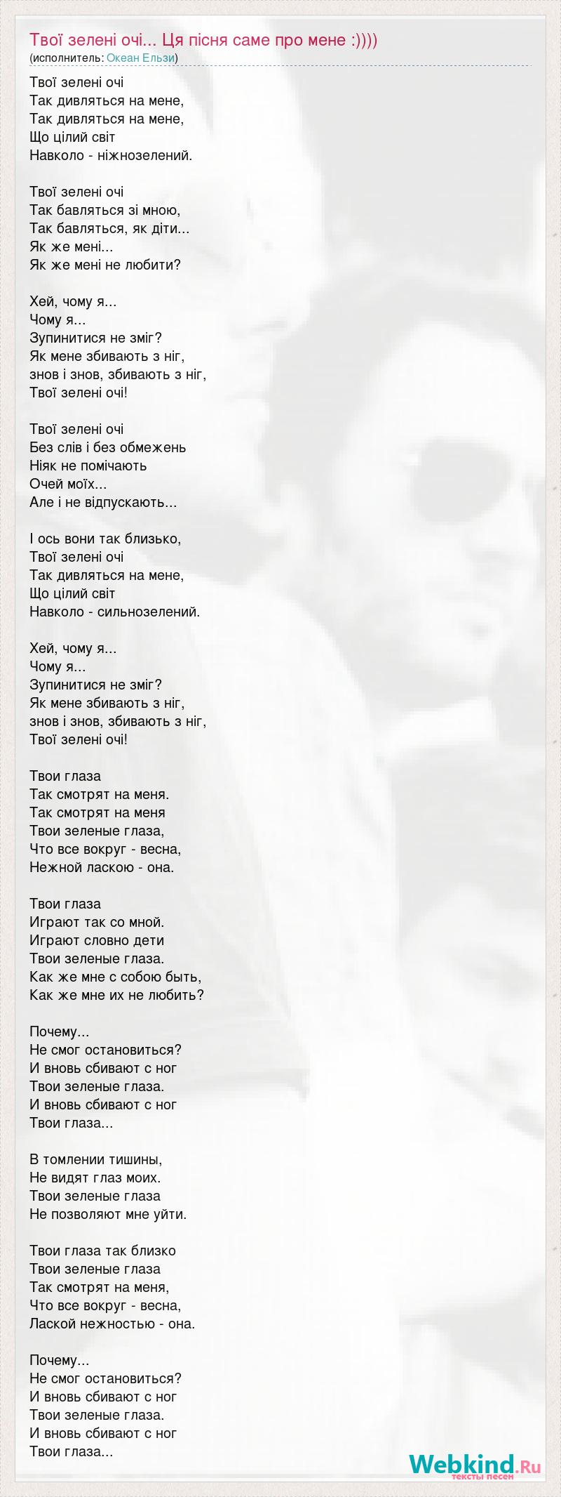 Твої зелені очі Так дивляться на мене, Так дивляться на мене, Що цілий світ Навколо - ніжнозелений. Твої зелені очі Так бавляться зі мною, Так бавляться, як діти... Як же мені... Як же мені не любити? Хей, чому я... Чому я... Зупинитися не зміг? Як мене збивають з ніг, знов і знов, збивають з ніг, Твої зелені очі! Твої зелені очі Без слів і без обмежень Ніяк не помічають Очей моїх... Але і не відпускають... І ось вони так близько, Твої зелені очі Так дивляться на мене, Що цілий світ Навколо - сильнозелений. Хей, чому я... Чому я... Зупинитися не зміг? Як мене збивають з ніг, знов і знов, збивають з ніг, Твої зелені очі! Твои глаза Так смотрят на меня. Так смотрят на меня Твои зеленые глаза, Что все вокруг - весна, Нежной ласкою - она. Твои глаза Играют так со мной. Играют словно дети Твои зеленые глаза. Как же мне с собою быть, Как же мне их не любить? Почему... Не смог остановиться? И вновь сбивают с ног Твои зеленые глаза. И вновь сбивают с ног Твои глаза... В томлении тишины, Не видят глаз моих. Твои зеленые глаза Не позволяют мне уйти. Твои глаза так близко Твои зеленые глаза Так смотрят на меня, Что все вокруг - весна, Лаской нежностью - она. Почему... Не смог остановиться? И вновь сбивают с ног Твои зеленые глаза. И вновь сбивают с ног Твои глаза...