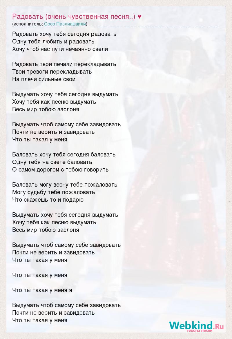 Радовать хочу тебя сегодня радовать Одну тебя любить и радовать Хочу чтоб нас пути нечаянно свели Радовать твои печали перекладывать Твои тревоги перекладывать На плечи сильные свои Выдумать хочу тебя сегодня выдумать Хочу тебя как песню выдумать Весь мир тобою заслоня Выдумать чтоб самому себе завидовать Почти не верить и завидовать Что ты такая у меня Баловать хочу тебя сегодня баловать Одну тебя на свете баловать О самом дорогом с тобою говорить Баловать могу весну тебе пожаловать Могу судьбу тебе пожаловать Что скажешь то и подарю Выдумать хочу тебя сегодня выдумать Хочу тебя как песню выдумать Весь мир тобою заслоня Выдумать чтоб самому себе завидовать Почти не верить и завидовать Что ты такая у меня Что ты такая у меня Что ты такая у меня я Выдумать чтоб самому себе завидовать Почти не верить и завидовать Что ты такая у меня