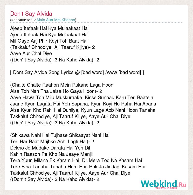 Ajeeb Itefaak Hai Kya Mulaakaat Hai Ajeeb Itefaak Hai Kya Mulaakaat Hai Mil Gaye Aaj Phir Koyi Toh Baat Hai (Takkaluf Chhodiye, Aji Taaruf Kijiye)- 2 Aaye Aur Chal Diye ((Don' t Say Alvida)- 3 Na Kaho Alvida)- 2 [ Dont Say Alvida Song Lyrics @ [bad word] /www [bad word] ] (Chalte Chalte Raahon Mein Rukane Laga Hoon Aisa Toh Nah Tha Jaisa Ho Gaya Hoon)- 2 Aaye Hawa Toh Milu Muskuraake, Kisse Sunaau Karu Teri Baatein Jaane Kyun Lagata Hai Yeh Sapana, Kyun Koyi Ho Raha Hai Apana Aise Kyun Kho Rahi Hai Duniiya, Kyun Lage Abb Nahi Hoon Tanaha Takkaluf Chhodiye, Aji Taaruf Kijiye, Aaye Aur Chal Diye ((Don' t Say Alvida)- 3 Na Kaho Alvida)- 2 (Shikawa Nahi Hai Tujhase Shikaayat Nahi Hai Teri Har Baat Mujhko Achi Lagti Hai)- 2 Dekho Jo Mudake Darata Hai Yeh Dil Kahin Raason Pe Kho Na Jaaye Manjil Tera Yuun Milana Ek Karam Hai, Dil Mera Tod Na Kasam Hai Tere Bina Tanaha Tanaha Hum Hai, Ruk Ja Jindagi Kasam Hai Takkaluf Chhodiye, Aji Taaruf Kijiye, Aaye Aur Chal Diye ((Don' t Say Alvida)- 3 Na Kaho Alvida)- 2
