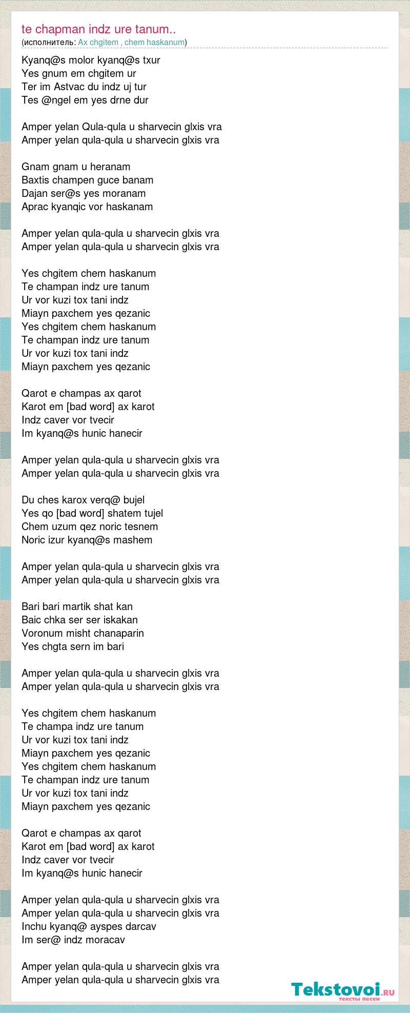 Kyanq@s molor kyanq@s txur Yes gnum em chgitem ur Ter im Astvac du indz uj tur Tes @ngel em yes drne dur Amper yelan Qula-qula u sharvecin glxis vra Amper yelan qula-qula u sharvecin glxis vra Gnam gnam u heranam Baxtis champen guce banam Dajan ser@s yes moranam Aprac kyanqic vor haskanam Amper yelan qula-qula u sharvecin glxis vra Amper yelan qula-qula u sharvecin glxis vra Yes chgitem chem haskanum Te champan indz ure tanum Ur vor kuzi tox tani indz Miayn paxchem yes qezanic Yes chgitem chem haskanum Te champan indz ure tanum Ur vor kuzi tox tani indz Miayn paxchem yes qezanic Qarot e champas ax qarot Karot em [bad word] ax karot Indz caver vor tvecir Im kyanq@s hunic hanecir Amper yelan qula-qula u sharvecin glxis vra Amper yelan qula-qula u sharvecin glxis vra Du ches karox verq@ bujel Yes qo [bad word] shatem tujel Chem uzum qez noric tesnem Noric izur kyanq@s mashem Amper yelan qula-qula u sharvecin glxis vra Amper yelan qula-qula u sharvecin glxis vra Bari bari martik shat kan Baic chka ser ser iskakan Voronum misht chanaparin Yes chgta sern im bari Amper yelan qula-qula u sharvecin glxis vra Amper yelan qula-qula u sharvecin glxis vra Yes chgitem chem haskanum Te champa indz ure tanum Ur vor kuzi tox tani indz Miayn paxchem yes qezanic Yes chgitem chem haskanum Te champan indz ure tanum Ur vor kuzi tox tani indz Miayn paxchem yes qezanic Qarot e champas ax qarot Karot em [bad word] ax karot Indz caver vor tvecir Im kyanq@s hunic hanecir Amper yelan qula-qula u sharvecin glxis vra Amper yelan qula-qula u sharvecin glxis vra Inchu kyanq@ ayspes darcav Im ser@ indz moracav Amper yelan qula-qula u sharvecin glxis vra Amper yelan qula-qula u sharvecin glxis vra