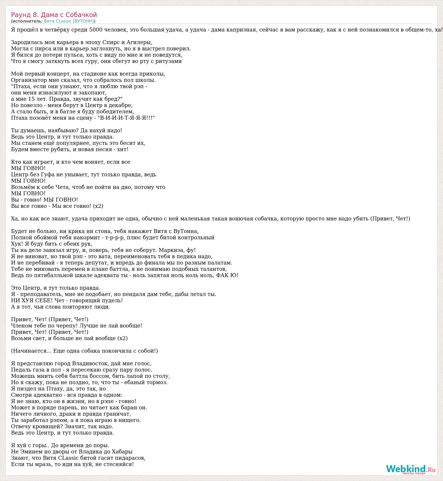 Я прошёл в четвёрку среди 5000 человек, это большая удача, а удача - дама капризная, сейчас я вам расскажу, как я с ней познакомился в общем-то, ха! Зародилась моя карьера в эпоху Спирс и Агилеры, Могла с пирса или в карьер заглохнуть, но я в выстрел поверил. Я бился до потери пульса, хоть с виду по мне и не поведутся, Что я смогу заткнуть всех гуру, они сбегут во рту с ритузами Мой первый концерт, на стадионе как всегда приколы, Организатор мне сказал, что собралось пол школы. "Птаха, если они узнают, что я люблю твой рэп - они меня изнасилуют и закопают, а мне 15 лет. Правда, звучит как бред?" Но повезло - меня берут в Центр в декабре, А стало быть, и в батле я буду победителем, Птаха позовёт меня на сцену - "В-И-И-И-Т-Я-Я-Я!!!" Ты думаешь, наябываю? Да нахуй надо! Ведь это Центр, и тут только правда. Мы станем ещё популярнее, пусть это бесит их, Будем вместе рубить, и новая песня - хит! Кто как играет, и кто чем воняет, если все МЫ ГОВНО! Центр без Гуфа не унывает, тут только правда, ведь МЫ ГОВНО! Возьмём к себе Чета, чтоб не пойти на дно, потому что МЫ ГОВНО! Вы - говно! МЫ ГОВНО! Вы все говно - Мы все говно! (x2) Ха, но как все знают, удача приходит не одна, обычно с ней маленькая такая вонючая собачка, которую просто мне надо убить (Привет, Чет!) Будет не больно, ни крика ни стона, тебя накажет Витя с ВуТонна, Полной обоймой тебя накормит - т-р-р-р, плюс будет битой контрольный Хук! Я буду бить с обеих рук, Ты на деле завязал игру, и, поверь, тебя не соберут. Маркиза, фу! Я не виноват, но твой рэп - это вата, переименовать тебя в педика надо, И не перебивай - я теперь депутат, и впредь до финала мы по разным палатам. Тебе не миновать перемен в плане баттла, я не понимаю подобных талантов, Ведь по пятибалльной шкале адеквата ты - ноль запятая ноль ноль ноль, ФАК Ю! Это Центр, и тут только правда. Я - преподаватель, мне не подобает, но пендаля дам тебе, дабы летал ты. НИ ХУЯ СЕБЕ! Чет - говорящий пудель! А я тот, чьи слова повторяют люди. Привет, Чет! (Привет, Чет!) Членом тебе по черепу! Лучше не лай вообще! Привет, Чет! (Привет, Чет!) Возьми свет, и больше не лай вообще (x2) (Начинается... Еще одна собака покончила с собой!) Я представляю город Владивосток, дай мне голос, Педаль газа в пол - я пересекаю сразу пару полос. Можешь мнить себя баттла боссом, бить лапой по столу, Но я скажу, пока не поздно, то, что ты - ебаный тормоз. Я пиздел на Птаху, да, это так, но Смотри адекватно - вся правда в одном: Я не знаю, кто он в жизни, но в рэпе - говно! Может в поряде парень, но читает как баран он. Ничего личного, драки и правда граничат, Ты заработал рэпом, а я пока играю в нищего. Отвечу кровищей? Значит, так надо. Ведь это Центр, и тут только правда. Я хуй с горы.. До времени до поры. Не Эминем но дворы от Владика до Хабары Знают, что Витя CLassic битой гасит пидарасов, Если ты мразь, то иди на хуй, не стесняйся!