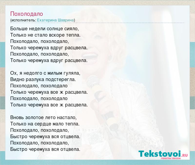 Больше недели солнце сияло, Только не стало вскоре тепла. Похолодало, похолодало, Только черемуха вдруг расцвела. Похолодало, похолодало, Только черемуха вдруг расцвела. Ох, я недолго с милым гуляла, Видно разлука подстерегла. Похолодало, похолодало Только черемуха все ж расцвела. Похолодало, похолодало Только черемуха все ж расцвела. Вновь золотое лето настало, Только на сердце мало тепла. Похолодало, похолодало, Быстро черемуха вся отцвела. Похолодало, похолодало, Быстро черемуха вся отцвела.