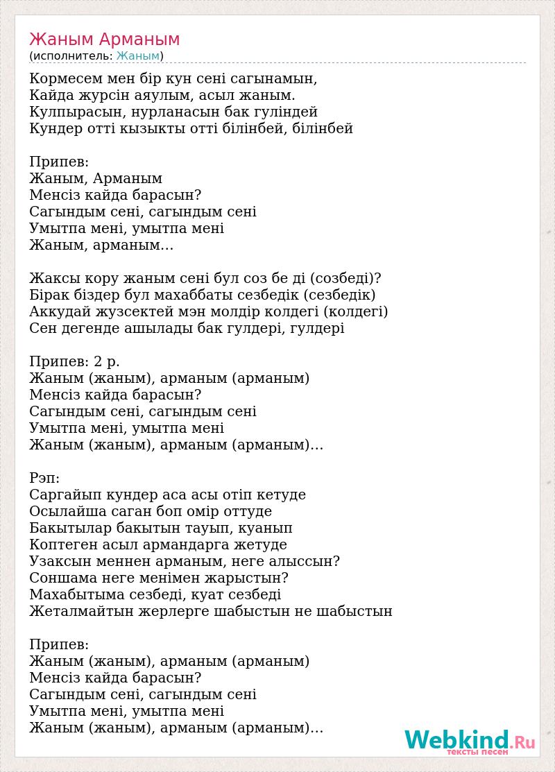 Кормесем мен бiр кун сенi сагынамын, Кайда журсiн аяулым, асыл жаным. Кулпырасын, нурланасын бак гулiндей Кундер оттi кызыкты оттi бiлiнбей, бiлiнбей Припев: Жаным, Арманым Менсiз кайда барасын? Сагындым сенi, сагындым сенi Умытпа менi, умытпа менi Жаным, арманым… Жаксы кору жаным сенi бул соз бе дi (созбедi)? Бiрак бiздер бул махаббаты сезбедiк (сезбедiк) Аккудай жузсектей мэн молдiр колдегi (колдегi) Cен дегенде ашылады бак гулдерi, гулдерi Припев: 2 р. Жаным (жаным), арманым (арманым) Менсiз кайда барасын? Сагындым сенi, сагындым сенi Умытпа менi, умытпа менi Жаным (жаным), арманым (арманым)… Рэп: Саргайып кундер аса асы отiп кетуде Осылайша саган боп омiр оттуде Бакытылар бакытын тауып, куанып Коптеген асыл армандарга жетуде Узаксын меннен арманым, неге алыссын? Соншама неге менiмен жарыстын? Махабытыма сезбедi, куат сезбедi Жеталмайтын жерлерге шабыстын не шабыстын Припев: Жаным (жаным), арманым (арманым) Менсiз кайда барасын? Сагындым сенi, сагындым сенi Умытпа менi, умытпа менi Жаным (жаным), арманым (арманым)…