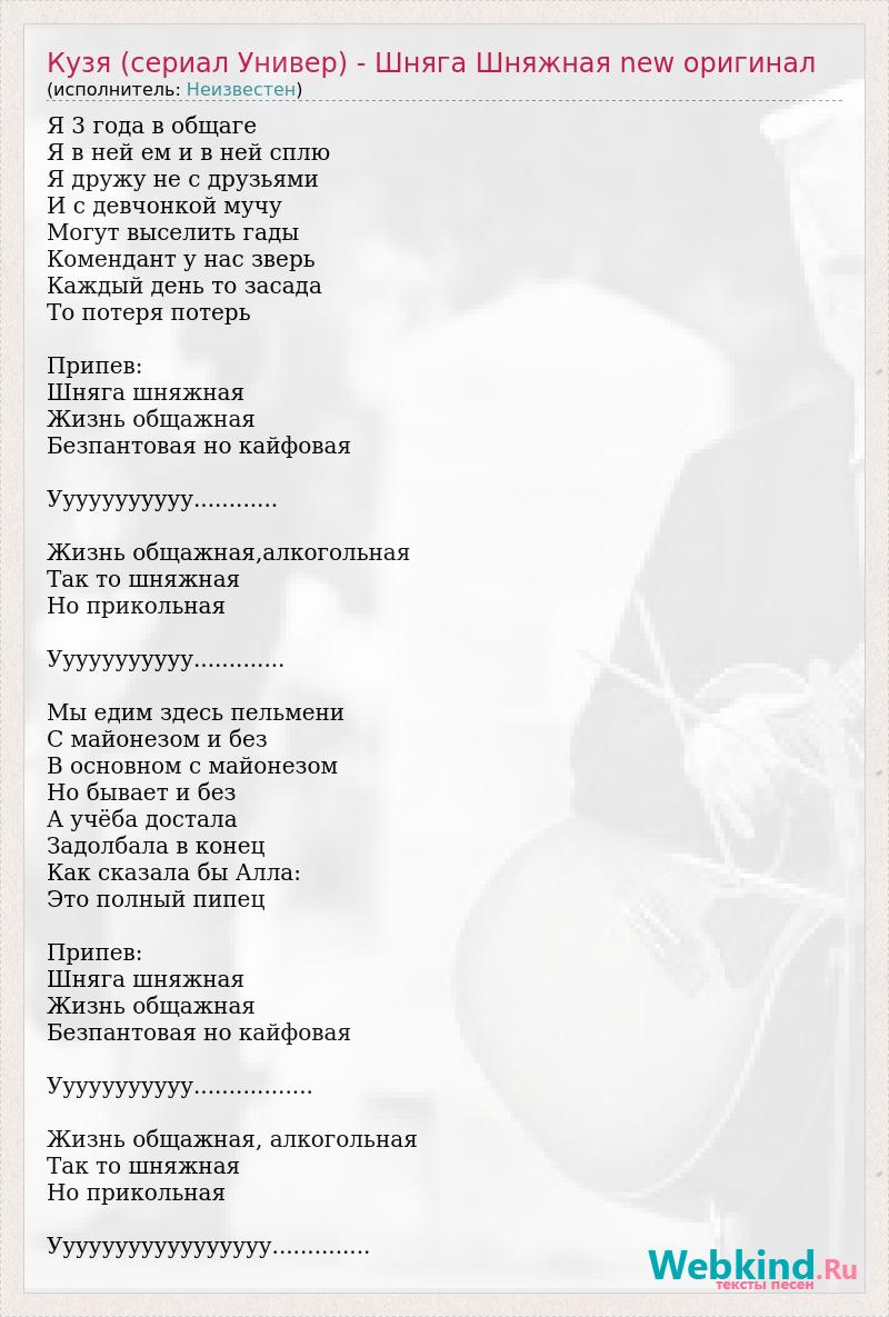 Я 3 года в общаге Я в ней ем и в ней сплю Я дружу не с друзьями И с девчонкой мучу Могут выселить гады Комендант у нас зверь Каждый день то засада То потеря потерь Припев: Шняга шняжная Жизнь общажная Безпантовая но кайфовая Ууууууууууу............ Жизнь общажная,алкогольная Так то шняжная Но прикольная Ууууууууууу............. Мы едим здесь пельмени С майонезом и без В основном с майонезом Но бывает и без А учёба достала Задолбала в конец Как сказала бы Алла: Это полный пипец Припев: Шняга шняжная Жизнь общажная Безпантовая но кайфовая Ууууууууууу................. Жизнь общажная, алкогольная Так то шняжная Но прикольная Ууууууууууууууууу..............