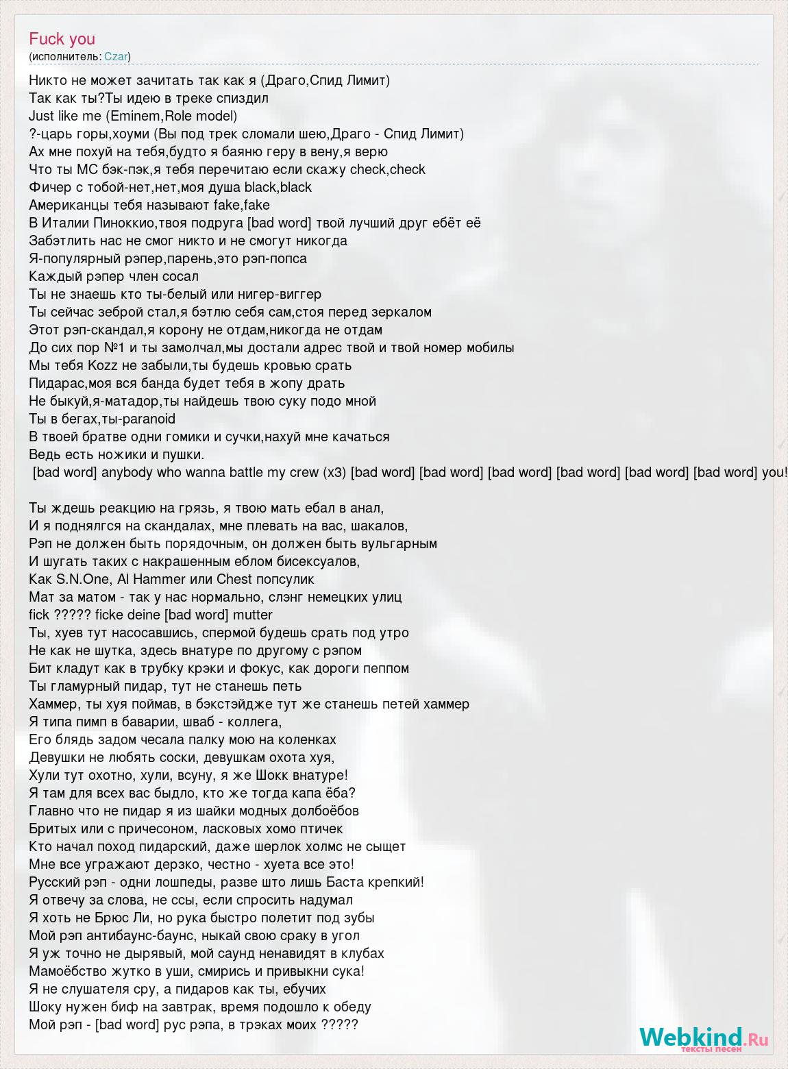 Никто не может зачитать так как я (Драго,Спид Лимит) Так как ты?Ты идею в треке спиздил Just like me (Eminem,Role model) ?-царь горы,хоуми (Вы под трек сломали шею,Драго - Спид Лимит) Ах мне похуй на тебя,будто я баяню геру в вену,я верю Что ты МС бэк-пэк,я тебя перечитаю если скажу check,check Фичер с тобой-нет,нет,моя душа black,black Американцы тебя называют fake,fake В Италии Пиноккио,твоя подруга [bad word] твой лучший друг ебёт её Забэтлить нас не смог никто и не смогут никогда Я-популярный рэпер,парень,это рэп-попса Каждый рэпер член сосал Ты не знаешь кто ты-белый или нигер-виггер Ты сейчас зеброй стал,я бэтлю себя сам,стоя перед зеркалом Этот рэп-скандал,я корону не отдам,никогда не отдам До сих пор №1 и ты замолчал,мы достали адрес твой и твой номер мобилы Мы тебя Kozz не забыли,ты будешь кровью срать Пидарас,моя вся банда будет тебя в жопу драть Не быкуй,я-матадор,ты найдешь твою суку подо мной Ты в бегах,ты-paranoid В твоей братве одни гомики и сучки,нахуй мне качаться Ведь есть ножики и пушки. [bad word] anybody who wanna battle my crew (x3) [bad word] [bad word] [bad word] [bad word] [bad word] [bad word] you! Ты ждешь реакцию на грязь, я твою мать ебал в анал, И я поднялгся на скандалах, мне плевать на вас, шакалов, Рэп не должен быть порядочным, он должен быть вульгарным И шугать таких с накрашенным еблом бисексуалов, Как S.N.One, Al Hammer или Chest попсулик Мат за матом - так у нас нормально, слэнг немецких улиц fick ????? ficke deine [bad word] mutter Ты, хуев тут насосавшись, спермой будешь срать под утро Не как не шутка, здесь внатуре по другому с рэпом Бит кладут как в трубку крэки и фокус, как дороги пеппом Ты гламурный пидар, тут не станешь петь Хаммер, ты хуя поймав, в бэкстэйдже тут же станешь петей хаммер Я типа пимп в баварии, шваб - коллега, Его блядь задом чесала палку мою на коленках Девушки не любять соски, девушкам охота хуя, Хули тут охотно, хули, всуну, я же Шокк внатуре! Я там для всех вас быдло, кто же тогда капа ёба? Главно что не пидар я из шайки модных долбоёбов Бритых или с причесоном, ласковых хомо птичек Кто начал поход пидарский, даже шерлок холмс не сыщет Мне все угражают дерзко, честно - хуета все это! Русский рэп - одни лошпеды, разве што лишь Баста крепкий! Я отвечу за слова, не ссы, если спросить надумал Я хоть не Брюс Ли, но рука быстро полетит под зубы Мой рэп антибаунс-баунс, ныкай свою сраку в угол Я уж точно не дырявый, мой саунд ненавидят в клубах Мамоёбство жутко в уши, смирись и привыкни сука! Я не слушателя сру, а пидаров как ты, ебучих Шоку нужен биф на завтрак, время подошло к обеду Мой рэп - [bad word] рус рэпа, в трэках моих ?????